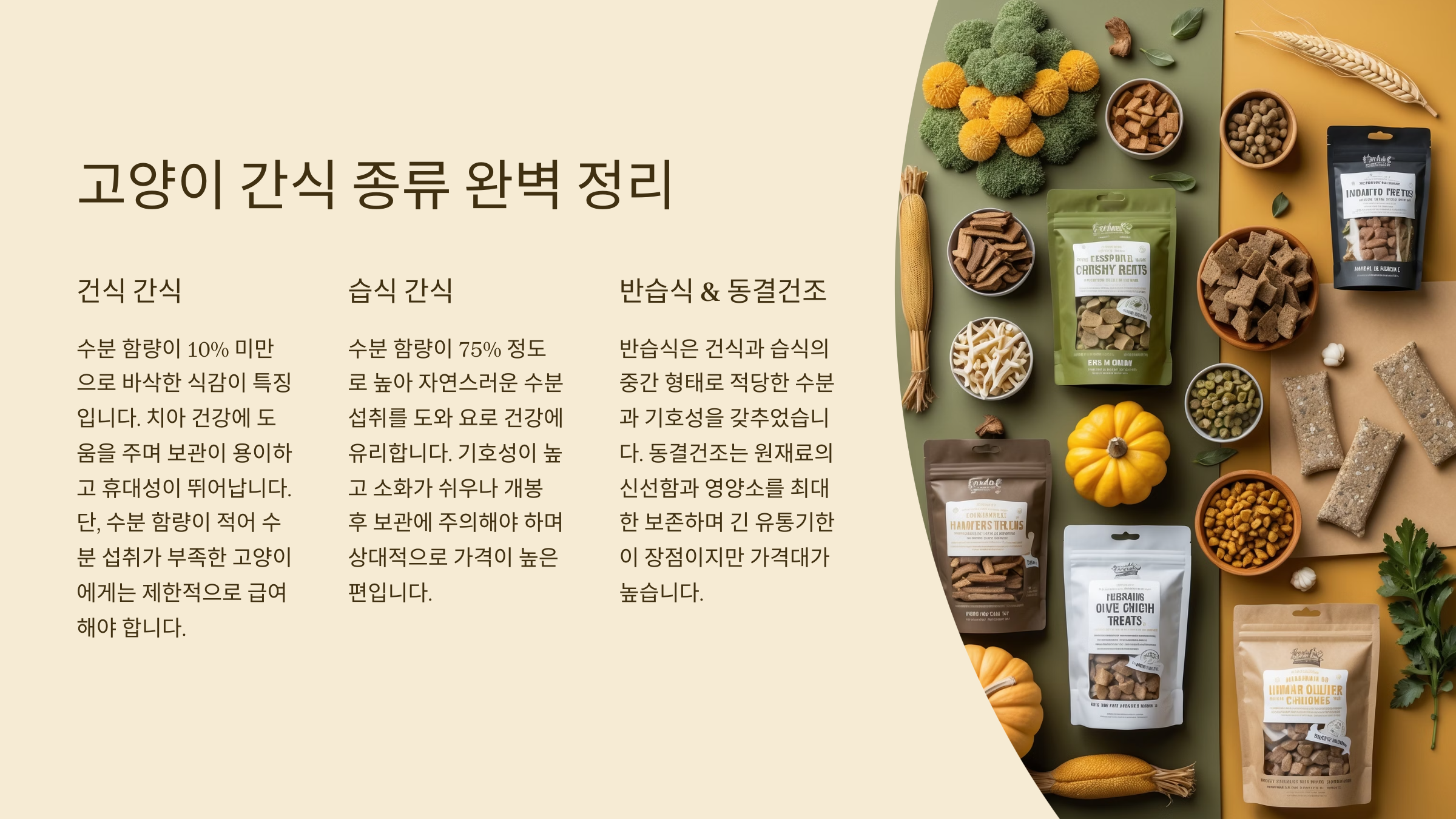 고양이 간식의 종류는 크게 세 가지로 나눌 수 있어요: 습식, 건식, 그리고 반습식이에요. 각각의 간식은 텍스처나 보관 방법은 물론이고, 기호성과 건강에 미치는 영향도 조금씩 달라요. 고양이마다 좋아하는 질감이 다르기 때문에, 다양한 타입을 경험해보게 하는 것도 좋아요.