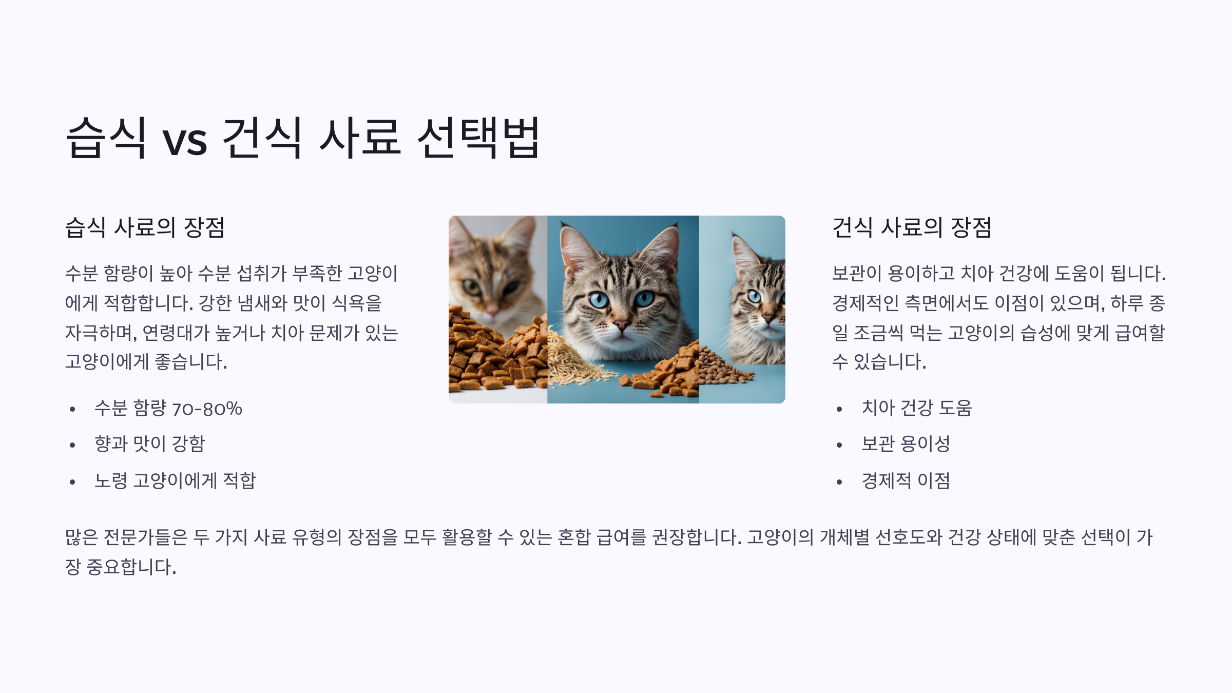 A5. 수분 섭취에는 유리하지만, 치아 건강 관리나 영양 밸런스를 위해 건식과 병행하는 ‘혼합 급식’이 더 좋아요.