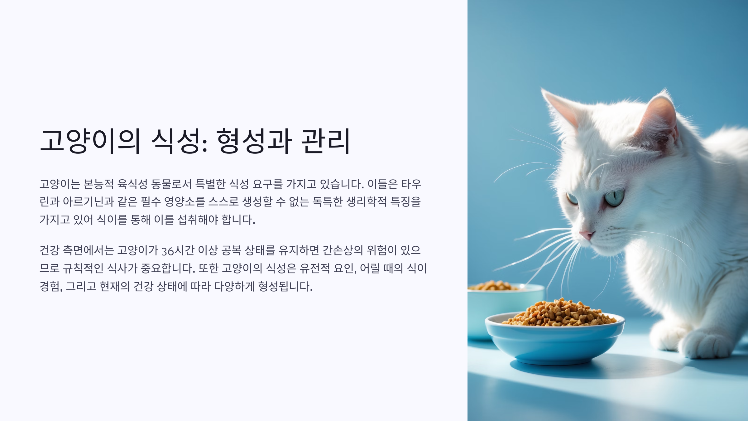 고양이들은 생각보다 매우 민감한 미식가예요. 사료의 종류도 단순히 ‘건식’과 ‘습식’으로 나누기에는 부족하죠. 입맛 까다로운 고양이일수록 질감, 향, 온도, 재료의 원산지까지 신경 쓰는 경우도 있어요. 그래서 어떤 고양이는 참치 베이스만 고집하고, 어떤 아이는 닭고기 외에는 거들떠보지도 않아요.