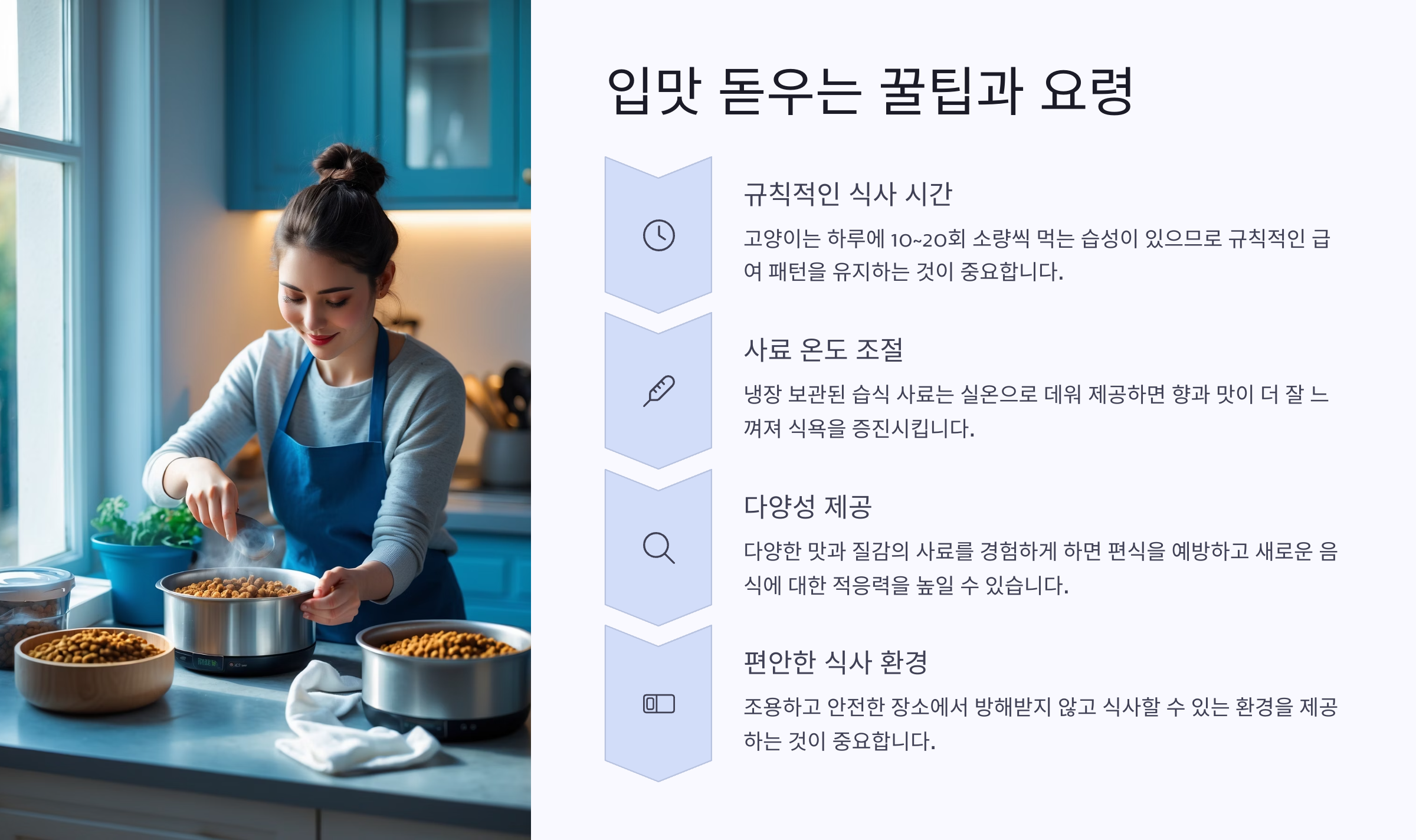 사료 온도 조절도 핵심이에요. 냉장고에서 꺼낸 습식사료는 고양이에게 무맛에 가깝게 느껴질 수 있어요. 전자레인지에 8~10초 정도 살짝 데워주면 냄새가 퍼지면서 식욕을 자극할 수 있어요. 단, 너무 뜨거우면 화상을 입을 수 있으니 꼭 손으로 온도를 확인해야 해요.
