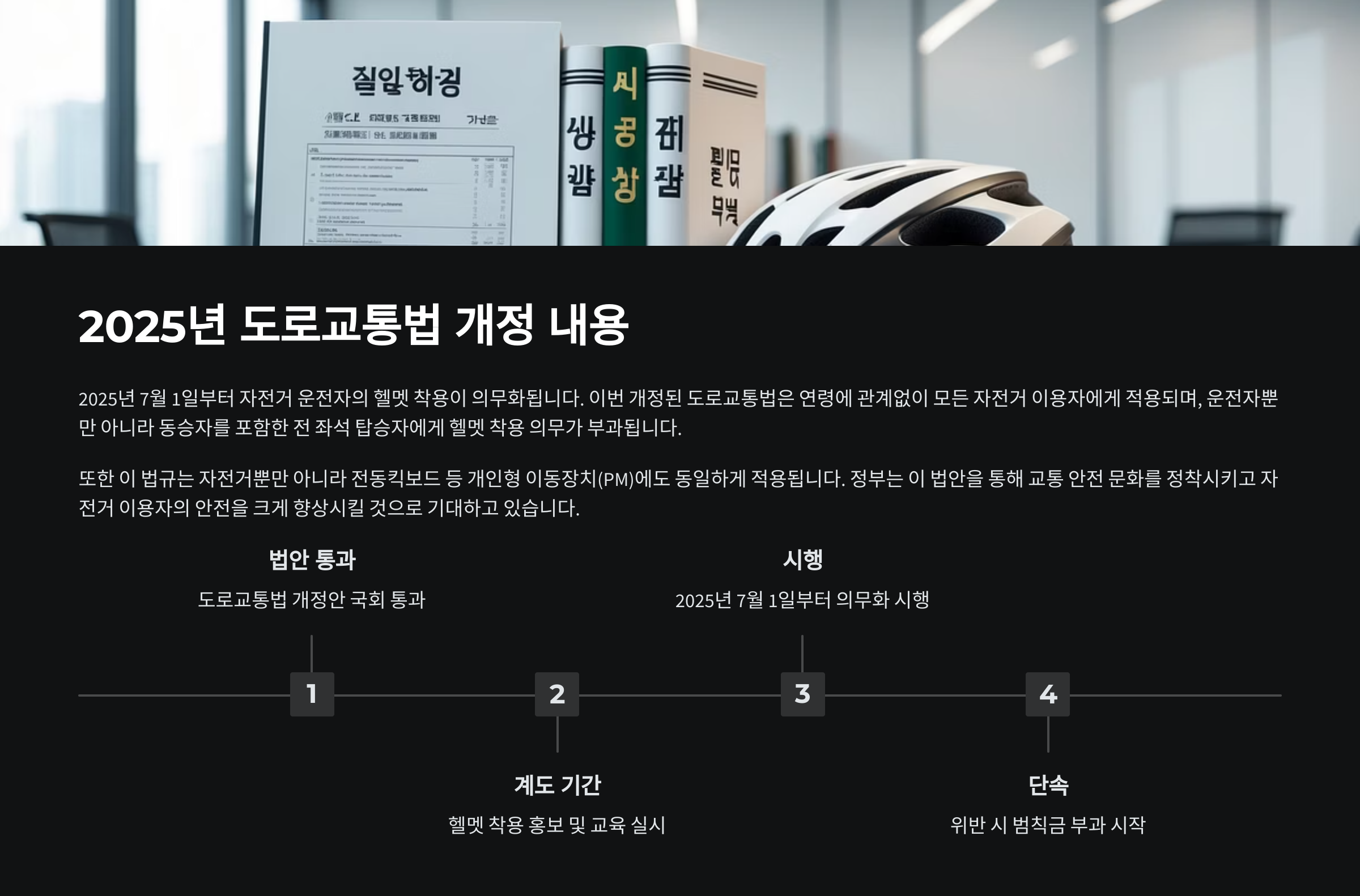 2025년부터 적용된 도로교통법 개정안은 자전거를 '차량의 일부'로 간주하고, 자전거 이용자의 안전 확보를 위해 보호장비 착용을 법적으로 명시했어요. 특히 헬멧 착용은 모든 연령, 모든 도로 구간에서 강력하게 적용되기 시작했답니다.