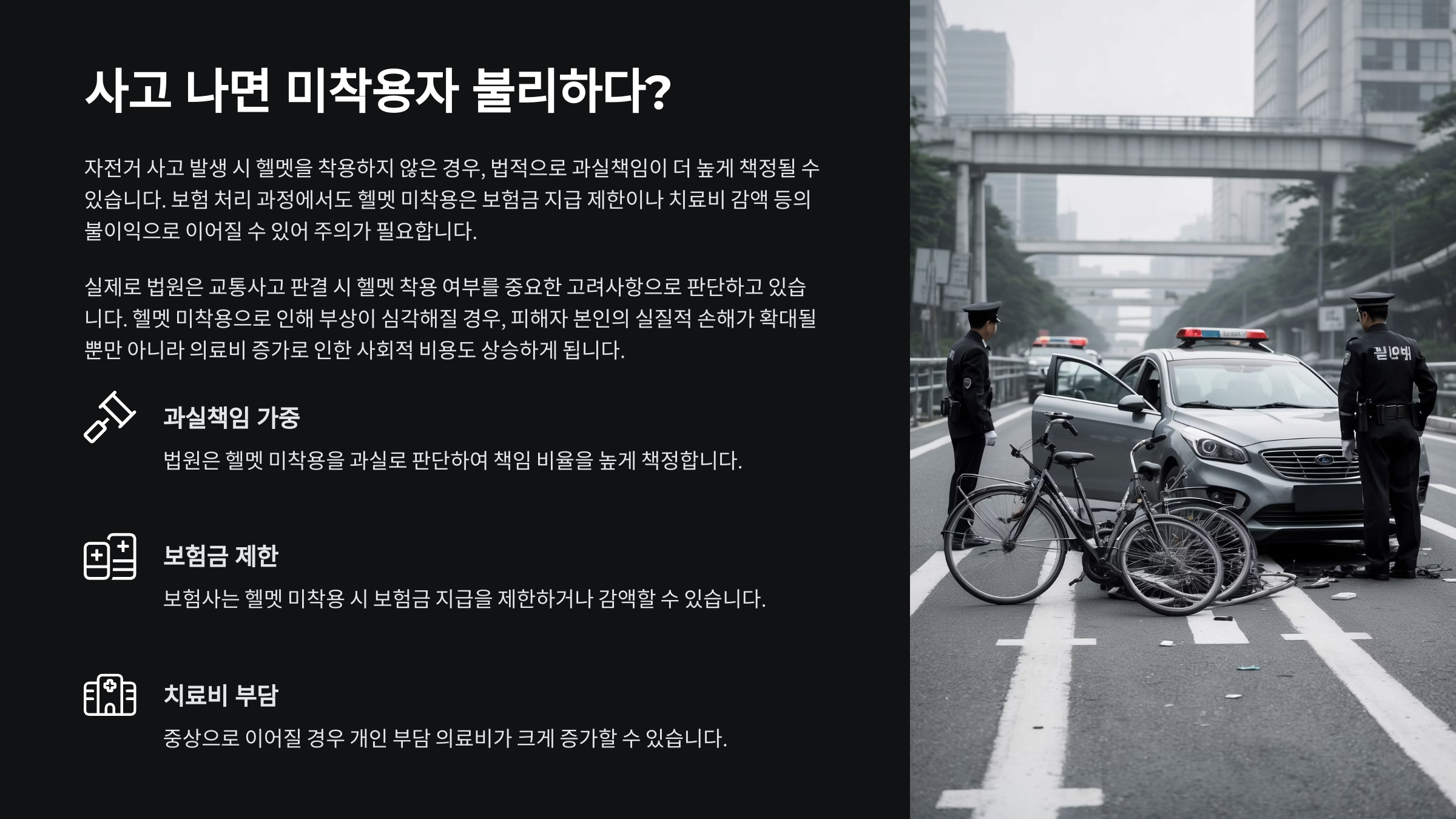 사고는 누구나 당할 수 있어요. 하지만 헬멧을 썼느냐, 안 썼느냐에 따라 그 이후의 결과는 완전히 달라져요. 단지 머리를 다치느냐 안 다치느냐의 문제가 아니라, 책임과 보상 구조 전체가 바뀌는 거예요.