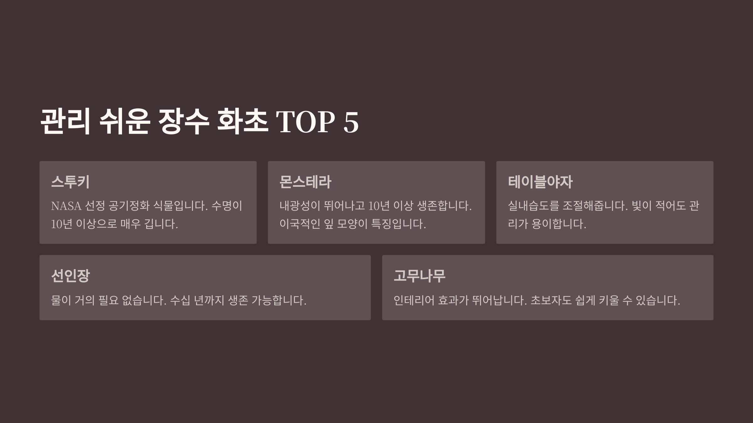 | 필로덴드론 | 그늘 OK | 10일 간격 | 공기정화, 고습도 선호 |