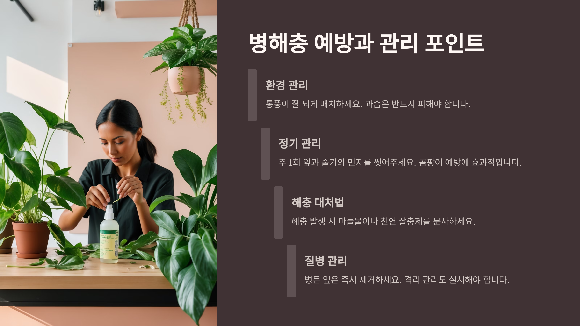 가장 흔한 병해충은 응애, 진딧물, 깍지벌레예요. 이 벌레들은 눈에 잘 띄지 않아서 초기엔 놓치기 쉬워요. 특히 응애는 잎 뒷면에 작은 점처럼 붙어 있어서 흙이나 먼지로 착각하기도 해요. 이런 해충은 통풍이 안 되거나 물을 과하게 줄 때 잘 생겨요. 그래서 물 조절과 함께 바람이 잘 통하는 환경을 만들어주는 게 중요해요.