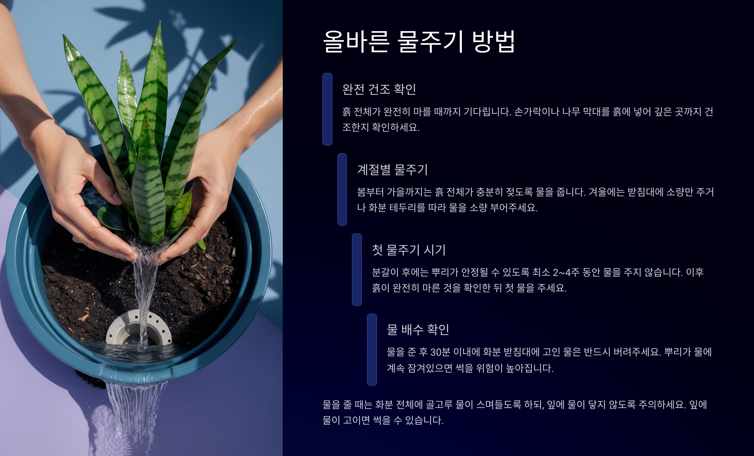 | 겨울 | 4~6주 | 오전 중 물주기, 보온 필수 |
