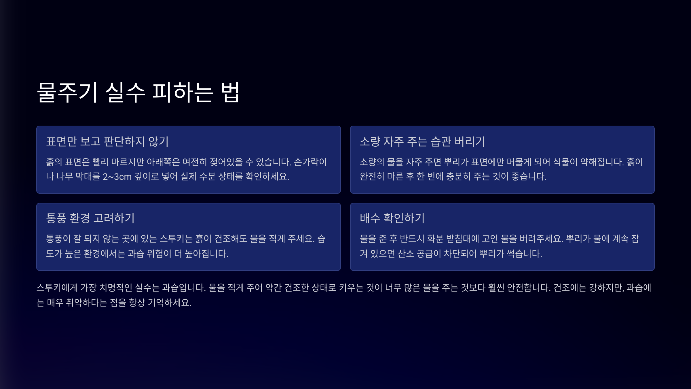스투키를 키우면서 가장 흔하게 발생하는 실수는 바로 ‘물을 너무 자주 주는 것’이에요. 특히 초보자일수록 흙이 마르면 불안해서 물을 주고 싶은 마음이 앞서지만, 이게 바로 뿌리를 썩게 만드는 원인이에요.
