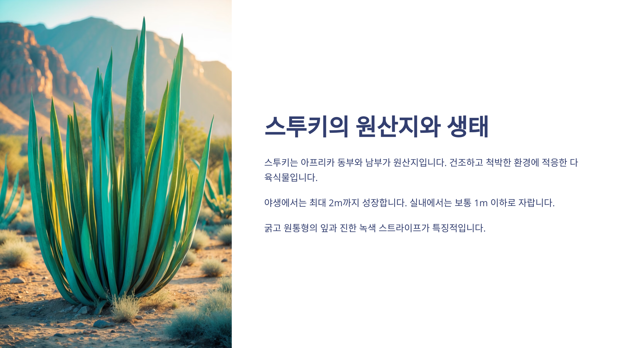 스투키(Sansevieria)는 원래 아프리카의 건조한 사막 지대에서 자라는 식물이에요. 고온다습한 환경보다 건조하고 햇빛이 강한 조건에 더 잘 적응하는 특징을 갖고 있죠. 물을 많이 필요로 하지 않고, 뿌리에 수분을 저장해 두고 천천히 쓰는 스타일이에요.