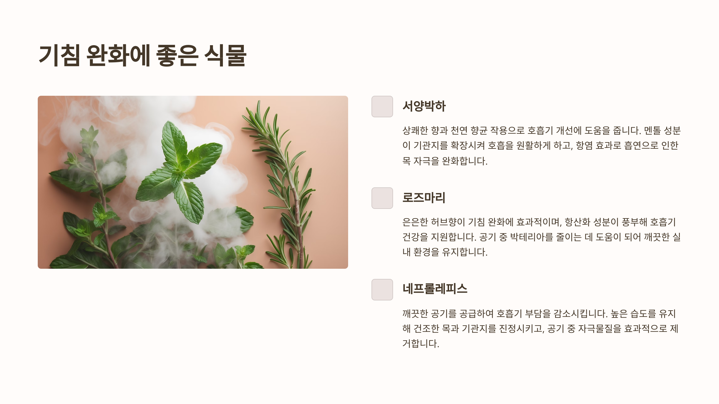 대표적으로 유칼립투스, 알로에 베라, 박하(민트), 라벤더, 레몬밤 등이 있어요. 이 식물들은 휘발성 향기 물질인 ‘피톤치드’를 방출하면서 실내 공기를 상쾌하게 만들고, 가벼운 호흡기 증상 완화에 효과적이에요. 🌿