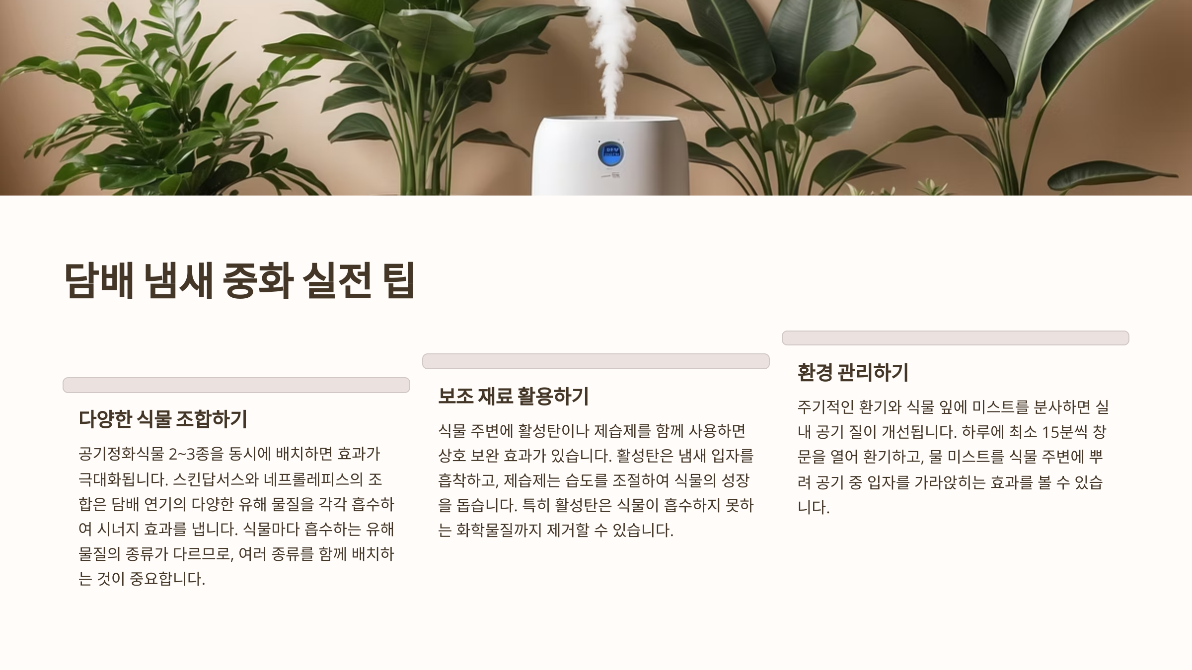 식물만으로도 어느 정도 냄새를 줄일 수 있지만, 담배 냄새는 다양한 방법을 병행해야 제대로 잡을 수 있어요. 특히 습기, 환기 부족, 잔류 연기 등이 복합적으로 냄새를 머금기 때문에 중화 전략이 필요해요. 🌬️