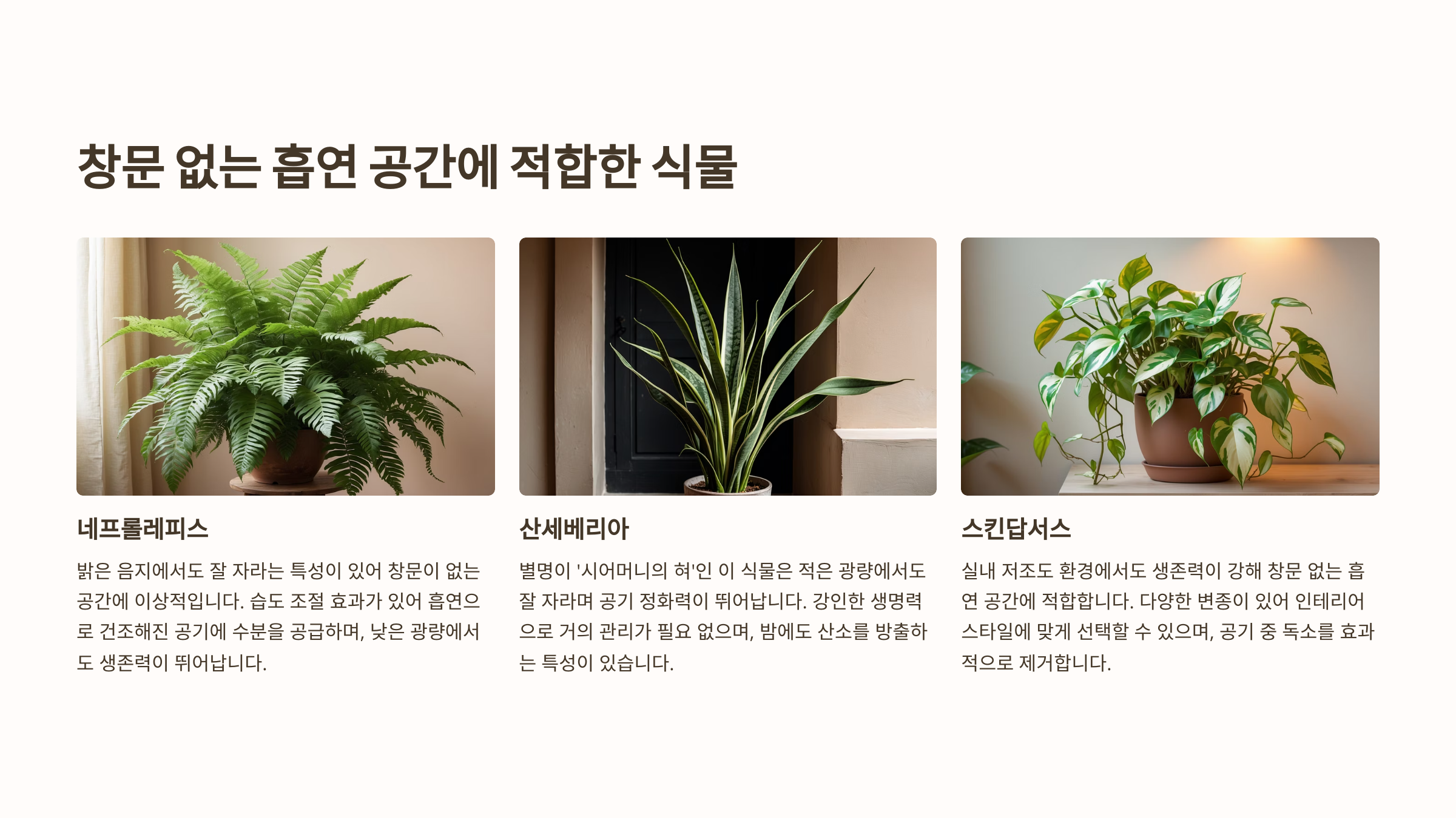 니코틴 제거를 목적으로 식물을 키운다면 단일 식물보다는 2~3종류를 함께 배치하는 게 더 효과적이에요. 특히 잎 표면적이 넓은 식물과 덩굴형 식물을 조합하면 공기 중 부유 물질까지 잘 흡수돼요. 이어서 창문 없는 공간에서 키우기 좋은 식물도 알아볼게요!
