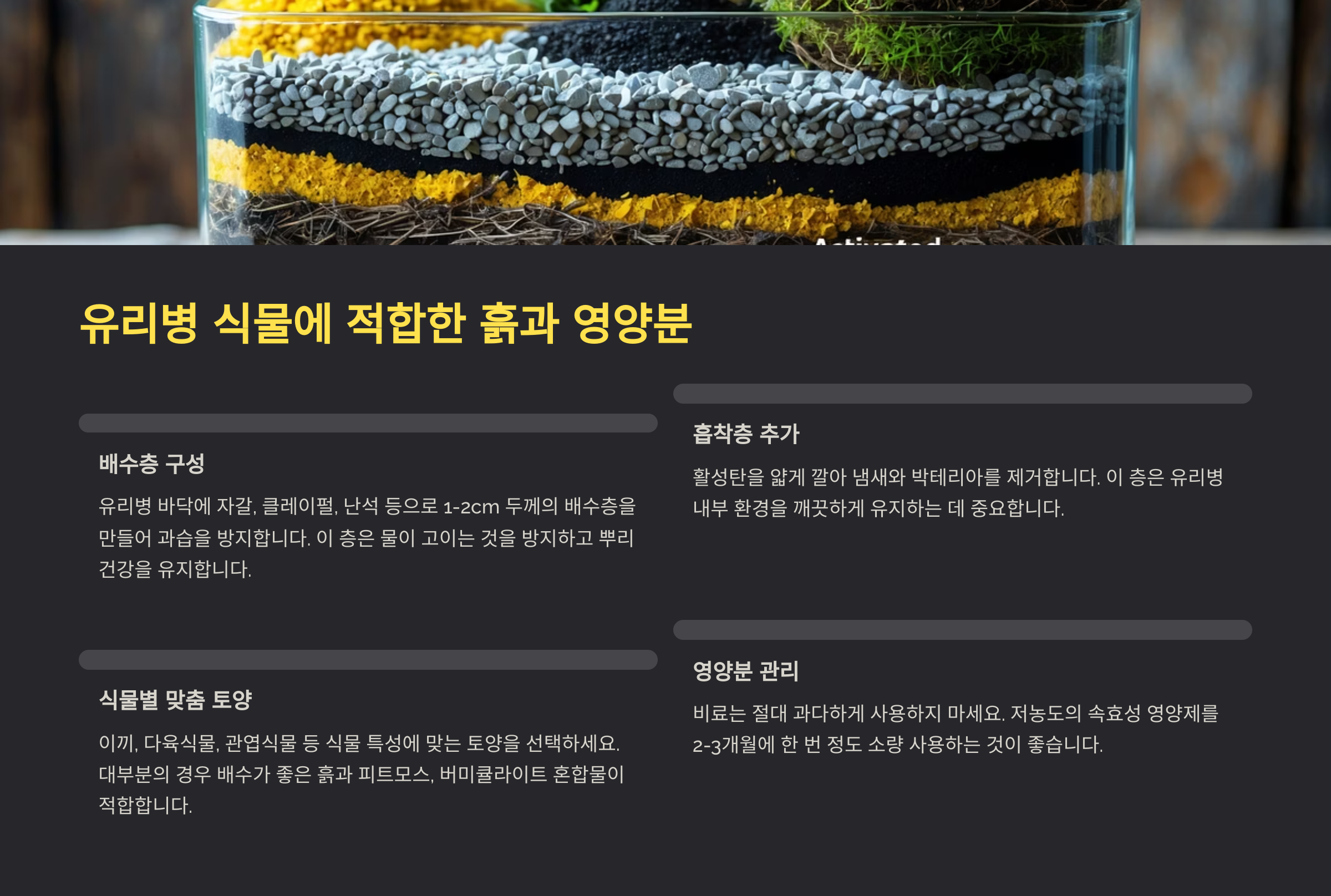 또한 유리병에는 바닥층 설계도 중요해요. 보통 맨 아래에 자갈을 깔고, 그 위에 숯(활성탄)을 얹은 뒤 흙을 채워요. 이렇게 하면 물이 고이지 않고, 냄새를 방지하면서 뿌리 썩음도 막을 수 있답니다. 유리병이 작은 경우라도 최소한 자갈 + 숯 + 흙 구조는 갖춰주는 게 좋아요.