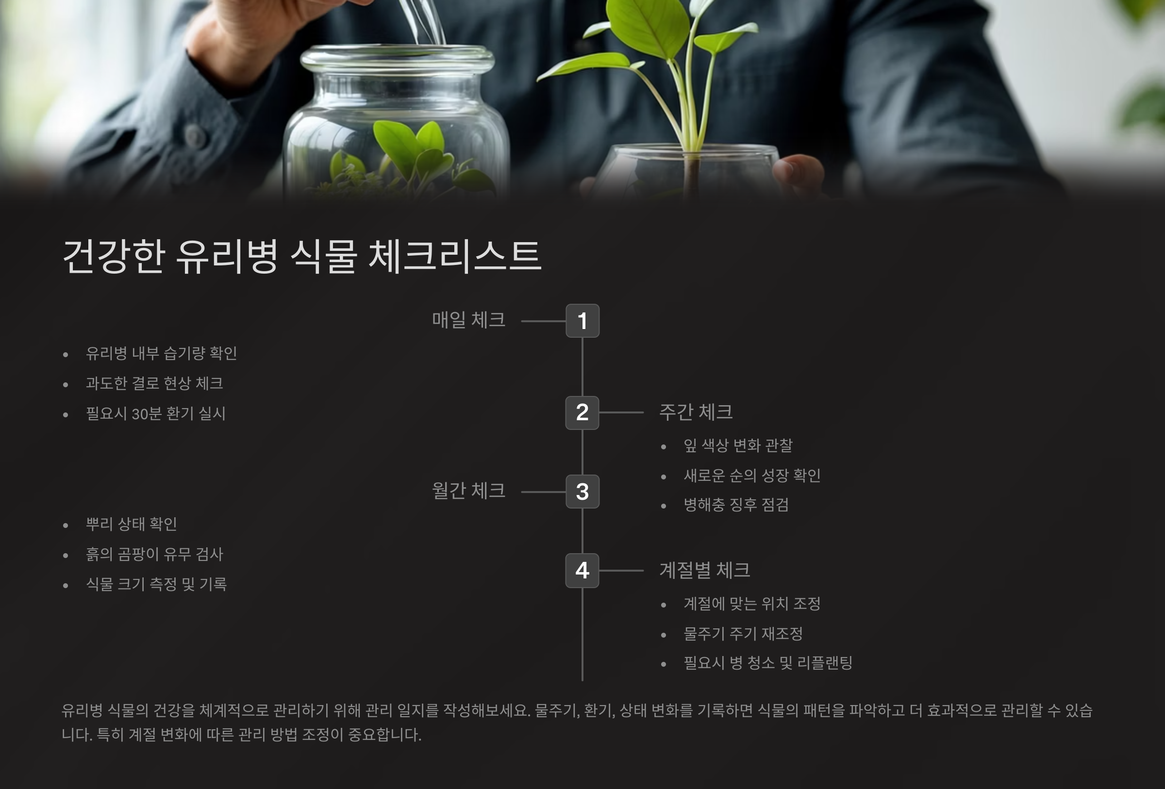 이렇게 체크리스트를 따라 주 1회만 꼼꼼히 점검해도 유리병 속 식물은 훨씬 오래, 훨씬 건강하게 자랄 수 있어요. 귀찮더라도 '잠깐의 확인'이 오랜 생장을 보장한답니다. 🌱