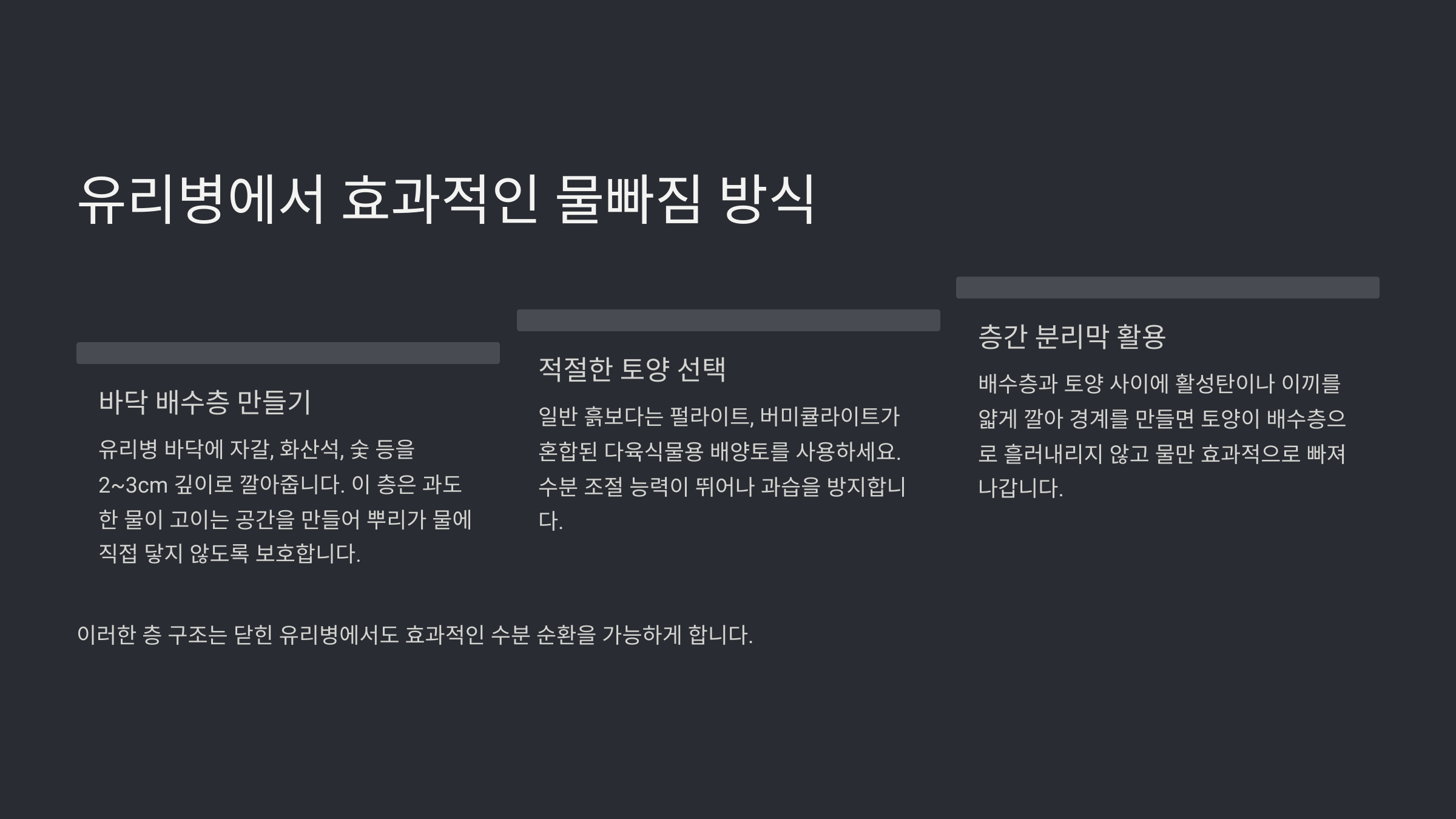 | 3단 | 배수성 좋은 흙 | 뿌리 생장 및 통기성 확보 |