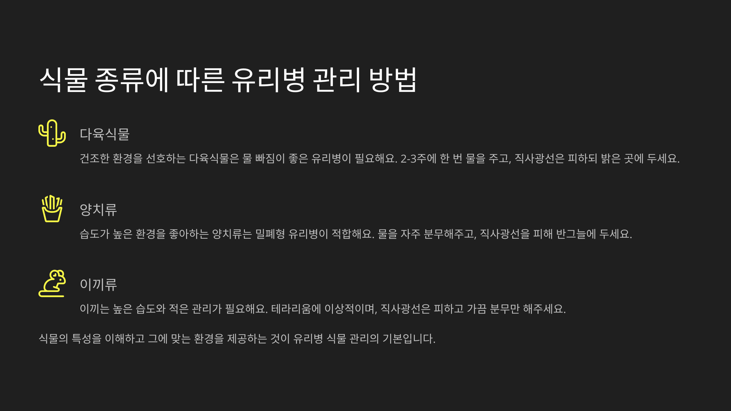 다육식물이나 선인장은 습도보다는 건조함을 유지하는 게 좋아요. 반대로 고사리나 이끼는 습한 환경이 중요하니까 자주 분무기를 사용하거나 물을 덜 증발시키는 밀폐형 병을 사용하는 게 유리하죠. 식물 종류에 따라 맞춤 관리가 필요해요.