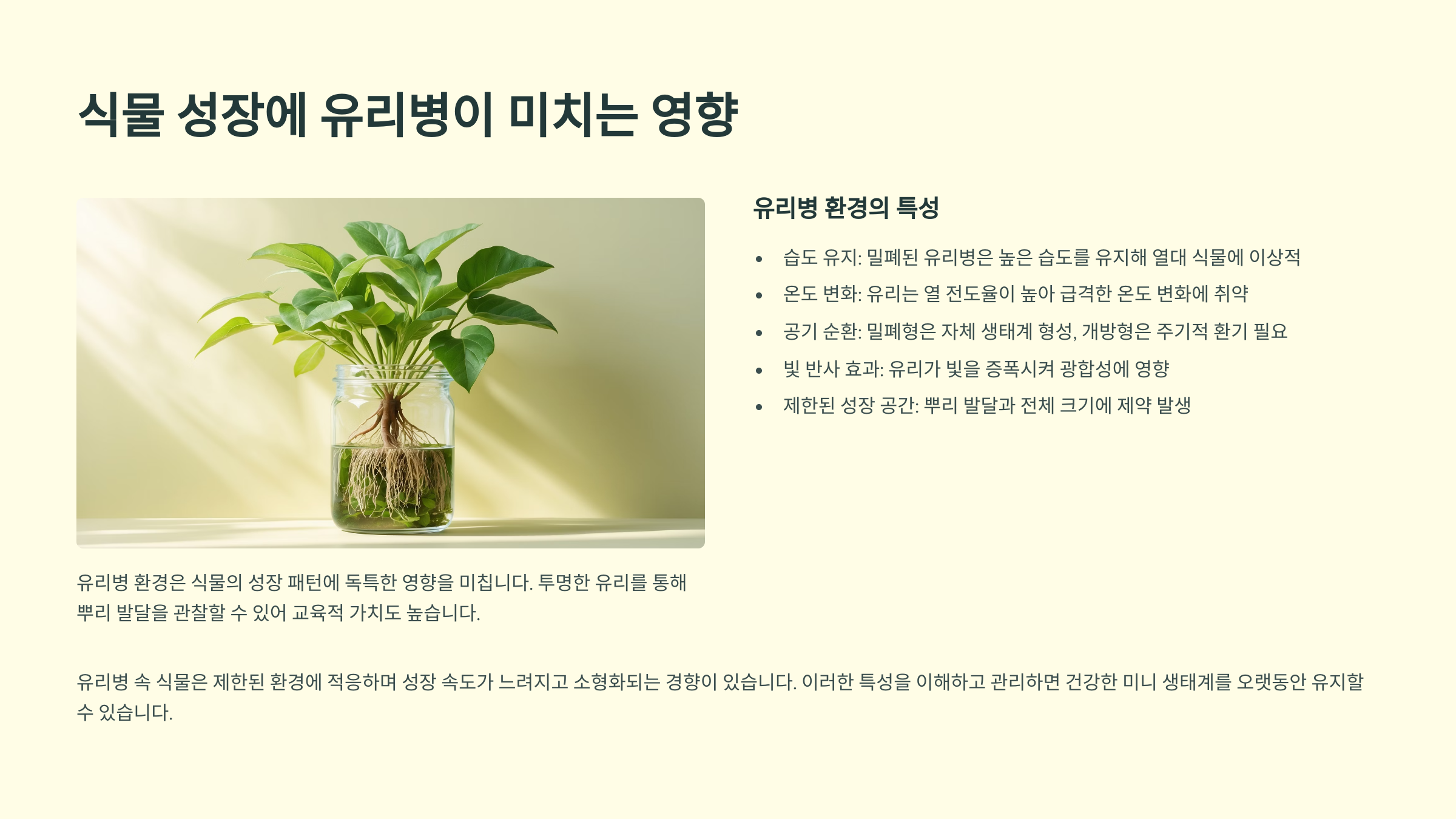 제가 생각했을 때, 유리병은 식물과 사람 모두에게 '쉬어가는 공간'을 제공하는 것 같아요. 빠른 성장이 아닌 안정된 성장, 바쁜 일상 속 차분함을 주는 도구랄까요?