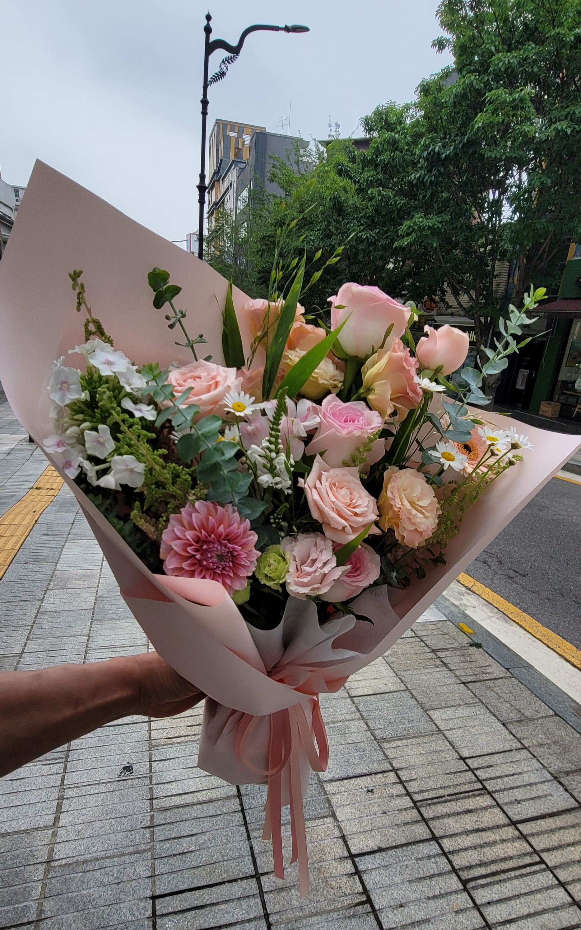 연핑크 장미를 중심으로, 흰 리시안셔스와 유칼립투스를 더했어요. 리시안셔스는 부드러움과 순수함이 느껴졌고, 유칼립투스는 그 자체로 고요한 분위기를 만들어줬어요. 꽃집 사장님께서 조화를 봐주시면서 "이 조합은 정말 잔잔하고 깊어요"라고 하시더라고요.
