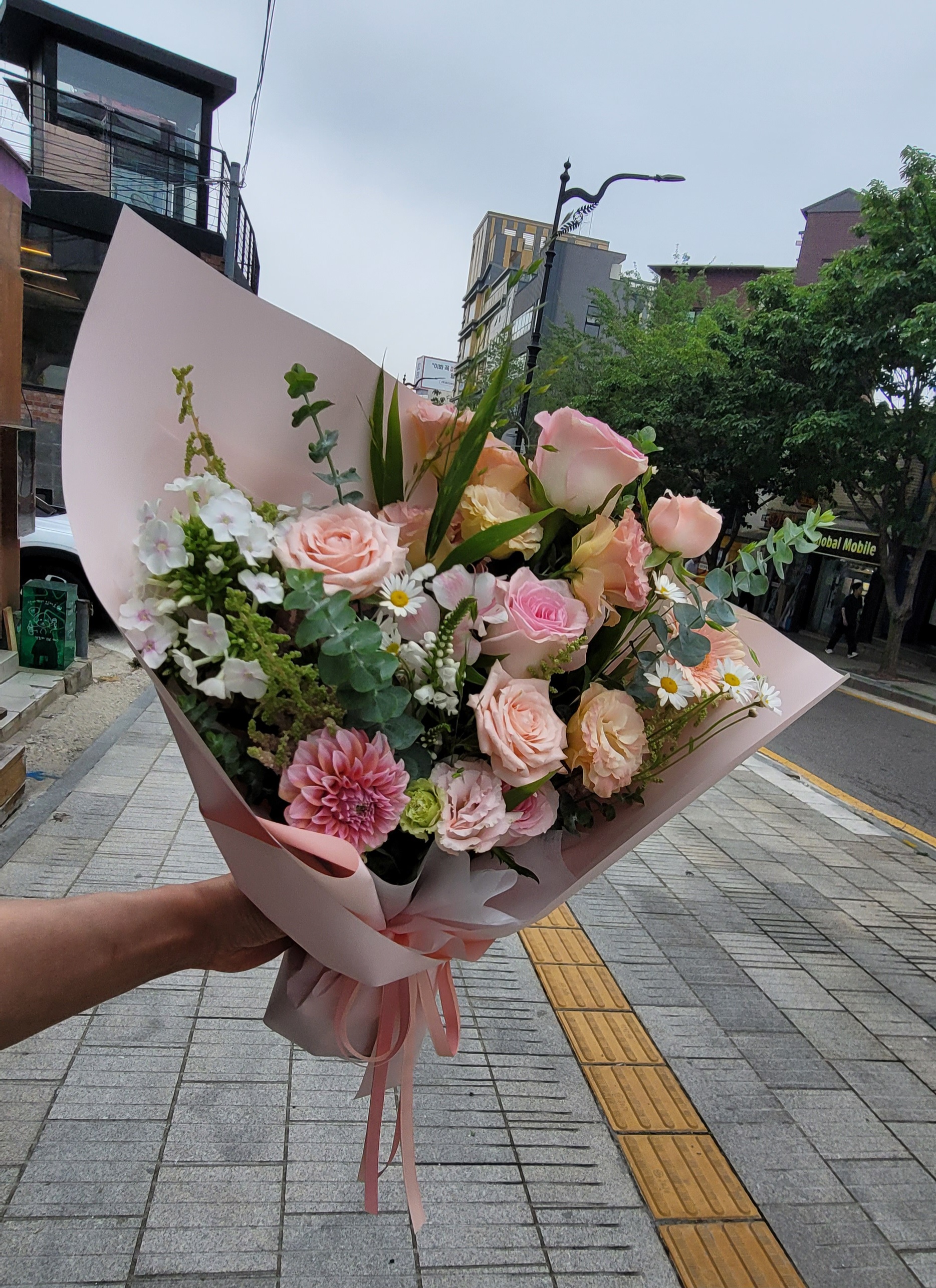처음 꽃을 고르는 것도, 포장을 고르는 것도 쉽지는 않았어요. 어떤 색이 좋을지, 어떤 분위기의 꽃다발이 어울릴지 고민하다가 결국 핑크빛의 장미와 리시안셔스, 그리고 유칼립투스를 섞은 은은한 꽃다발을 만들었어요. 꽃집 사장님께서 “이거, 어머니들이 참 좋아하세요”라고 말해주시더라고요. 😊