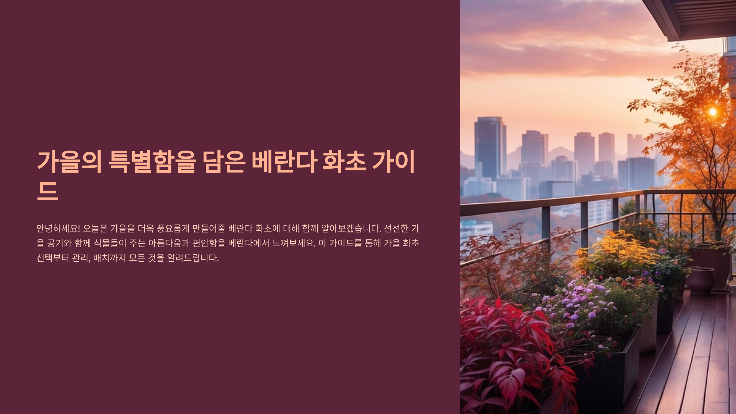 가을이 되면 공기가 선선해지면서 베란다를 아름답게 꾸미기 딱 좋은 계절이 찾아와요. 이 시기에는 너무 덥지도 않고, 서늘한 바람과 함께 햇볕도 부드러워지기 때문에 식물에게는 가장 안정적인 환경이 조성되죠.