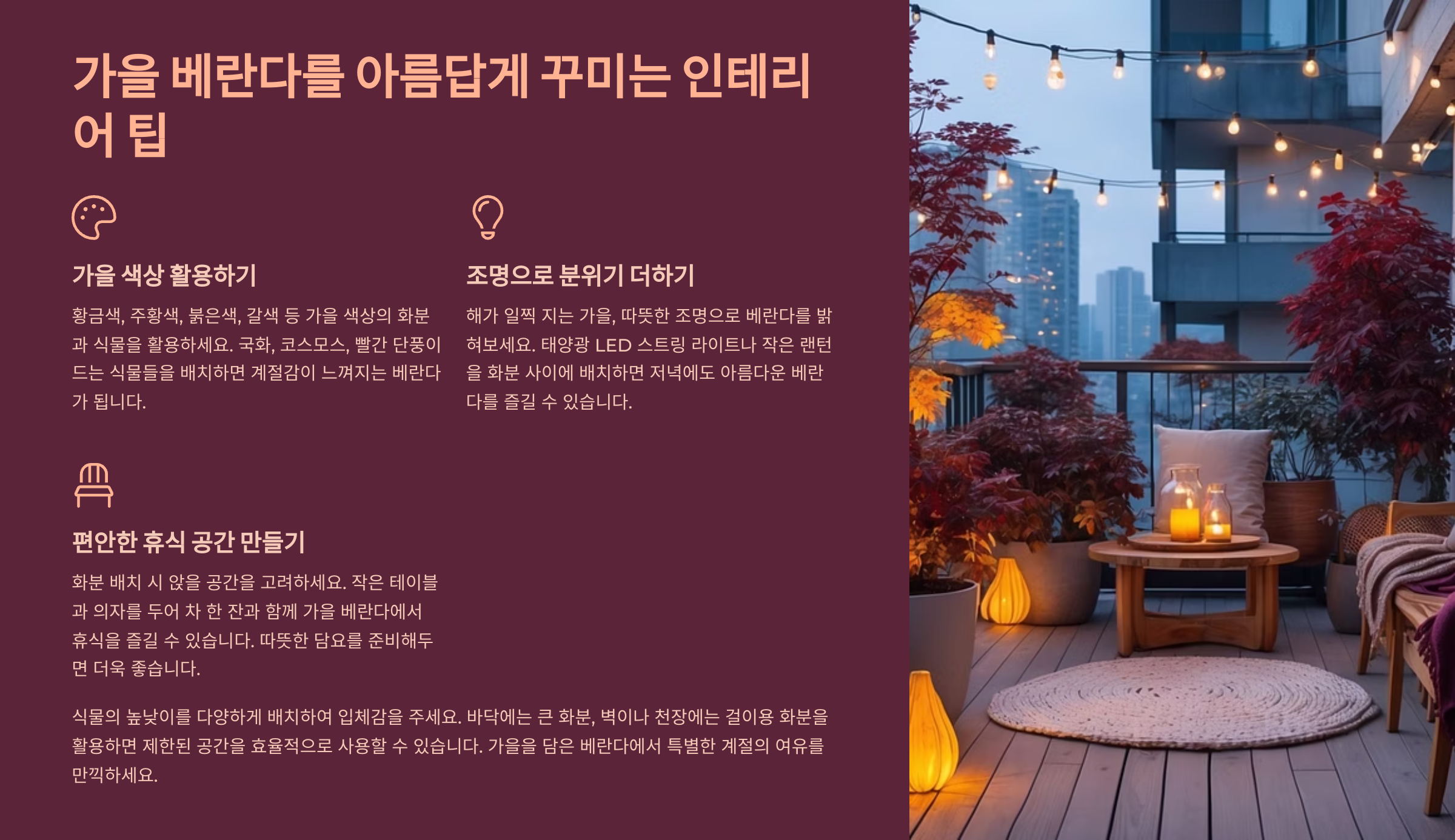 내가 생각했을 때 가을 베란다는 단순히 식물을 놓는 공간이 아니라, 계절의 분위기를 실내로 가져오는 따뜻한 쉼터가 될 수 있다고 봐요.