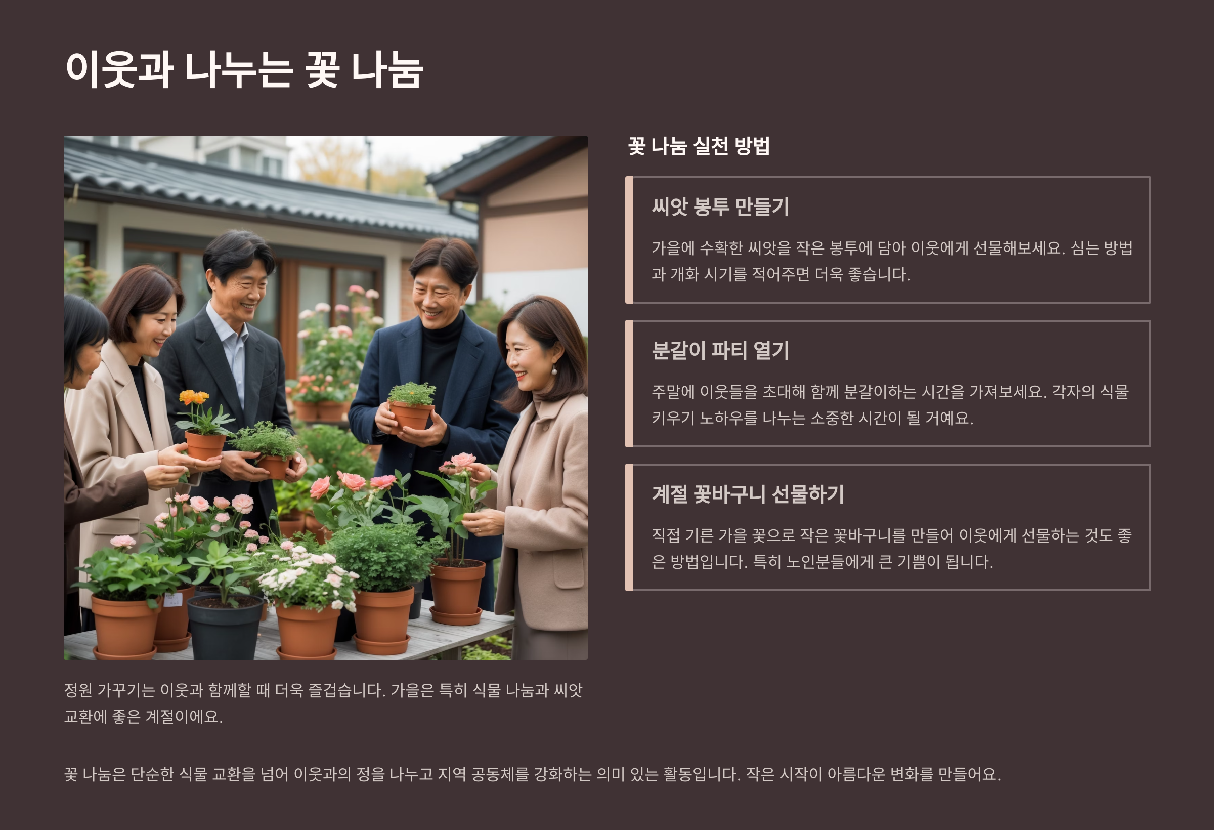 작은 마당이라도 꽃을 가득 심어두면 나 혼자 보기 아까울 때가 있어요. 그런 기분이 들 때 이웃과 꽃을 나누면 훨씬 따뜻한 분위기가 되죠. 특히 가을철 국화나 코스모스 같은 꽃들은 잘 자라서 나누기에도 좋아요. 꽃 나눔은 단순히 식물 나눔을 넘어서 사람 사이의 정까지 이어져요.