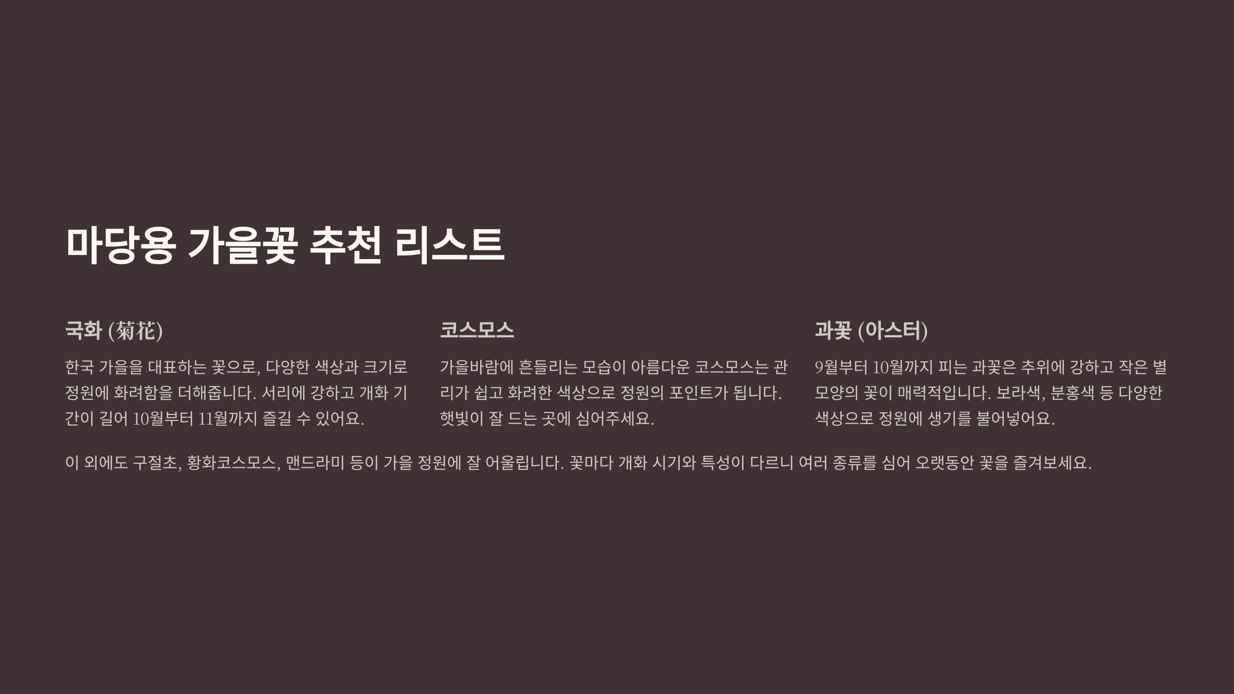 작은 마당을 가을꽃으로 꾸밀 때 가장 중요한 건 공간에 맞는 꽃을 고르는 거예요. 키가 너무 크거나 관리가 어려운 꽃보다는, 적당한 높이와 색감을 가진 가을꽃을 선택하는 것이 좋아요. 초보자에게도 쉽고, 가을 감성이 물씬 나는 추천 리스트를 소개할게요!