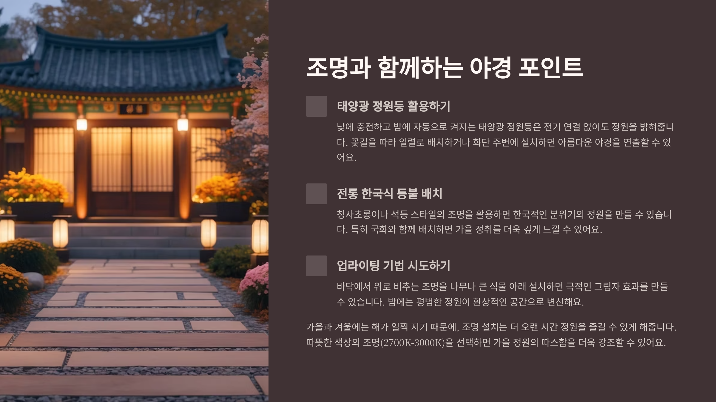 가을 저녁, 작은 마당에 은은한 조명이 켜져 있으면 마치 영화 속 한 장면처럼 감성적인 분위기가 완성돼요. 낮에 보는 꽃도 예쁘지만, 밤에도 꽃과 공간이 살아 있도록 조명을 활용하는 것이 요즘 인기랍니다. 작은 마당일수록 조명 배치가 훨씬 중요한 역할을 해요.