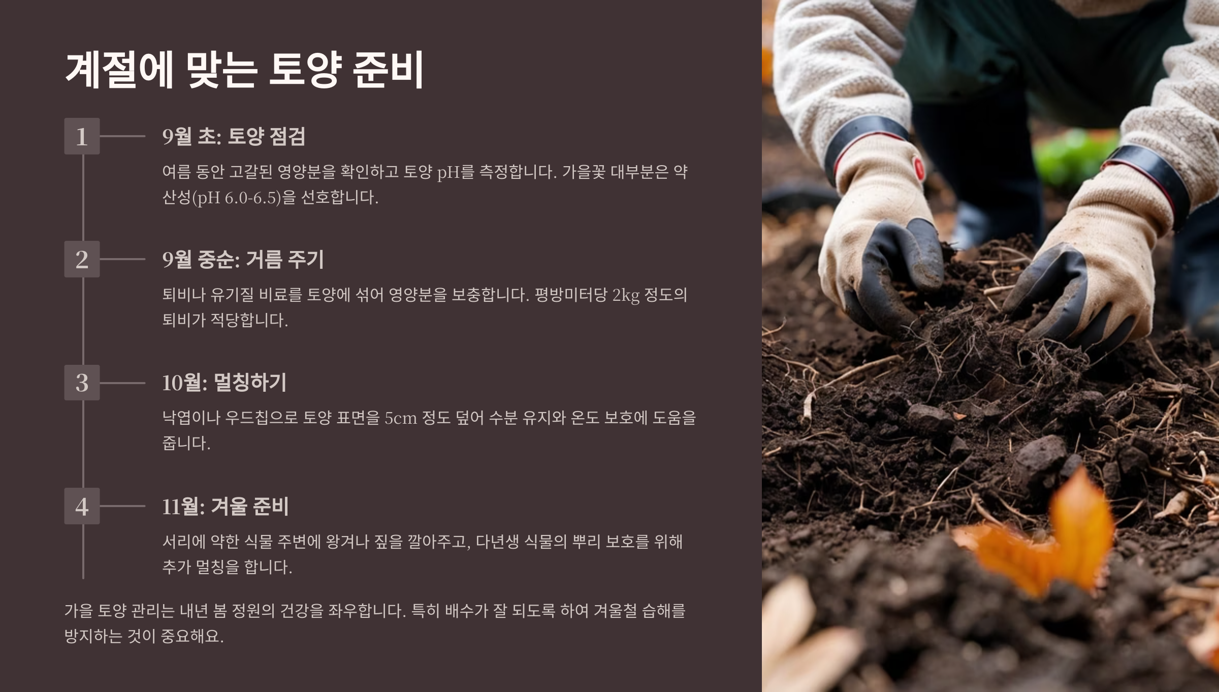 작은 마당을 가을꽃으로 가득 채우려면 토양부터 잘 준비해야 해요. 가을철은 비가 적고 온도가 서늘해지는 시기라서, 흙의 배수성과 보습성 균형이 특히 중요해요. 마당 흙이 너무 딱딱하거나 물빠짐이 안 좋으면 뿌리가 썩거나 꽃이 시들기 쉽답니다.