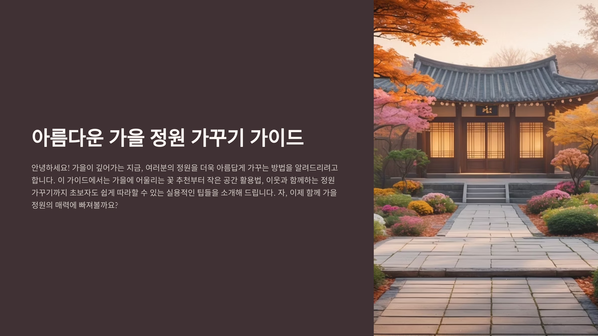 가을이 오면 작은 마당도 풍성한 분위기로 바꾸고 싶어지죠. 특히 작은 마당이라도 가을꽃을 심어 두면 분위기가 확 달라진답니다. 공간이 작아도 색감과 식물 배치만 잘하면 넓은 정원 부럽지 않은 분위기를 만들 수 있어요.