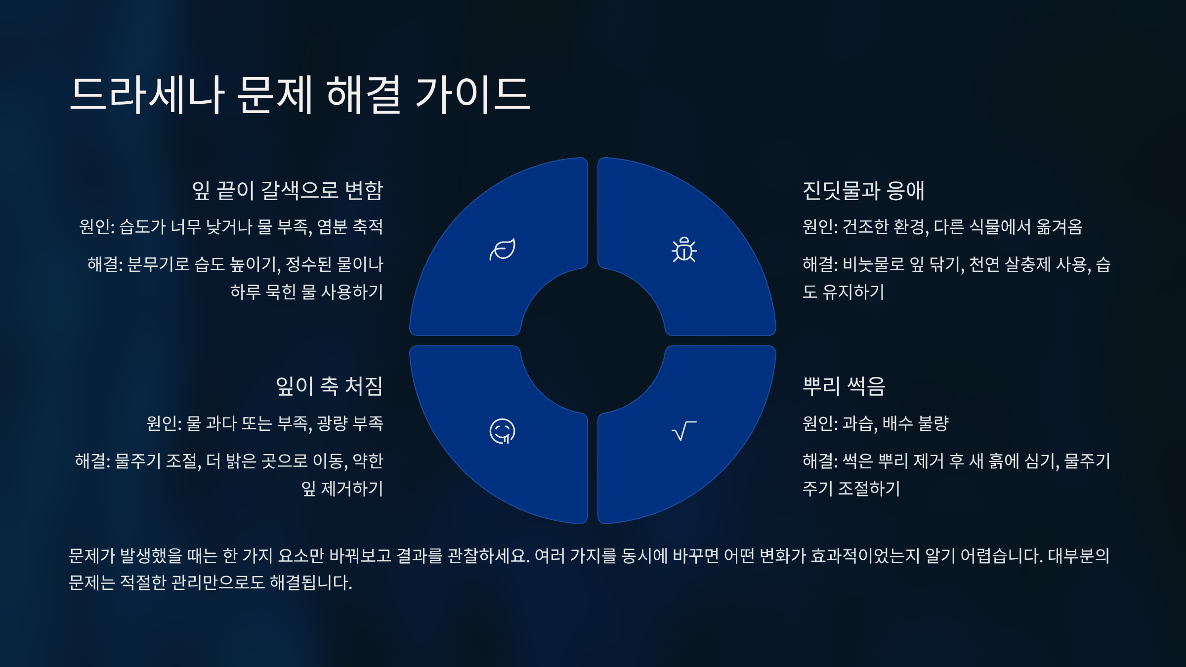 드라세나를 키우다 보면 갑자기 잎 끝이 마르거나, 누렇게 변하거나, 심지어 벌레가 생기기도 해요. 이런 문제는 대부분 환경 조건의 변화나 잘못된 관리 습관에서 비롯돼요. 하나씩 원인을 짚고 해결법을 알려드릴게요.🌿