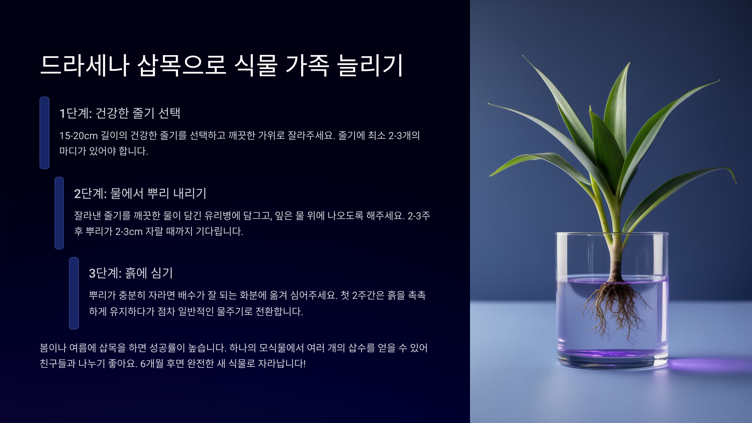 드라세나는 생장이 빠른 편이라 삽목 후에도 금방 잎이 자라나기 시작해요. 조금만 정성을 들이면 기존 화분에서 여러 개의 새로운 드라세나를 만들 수 있답니다.