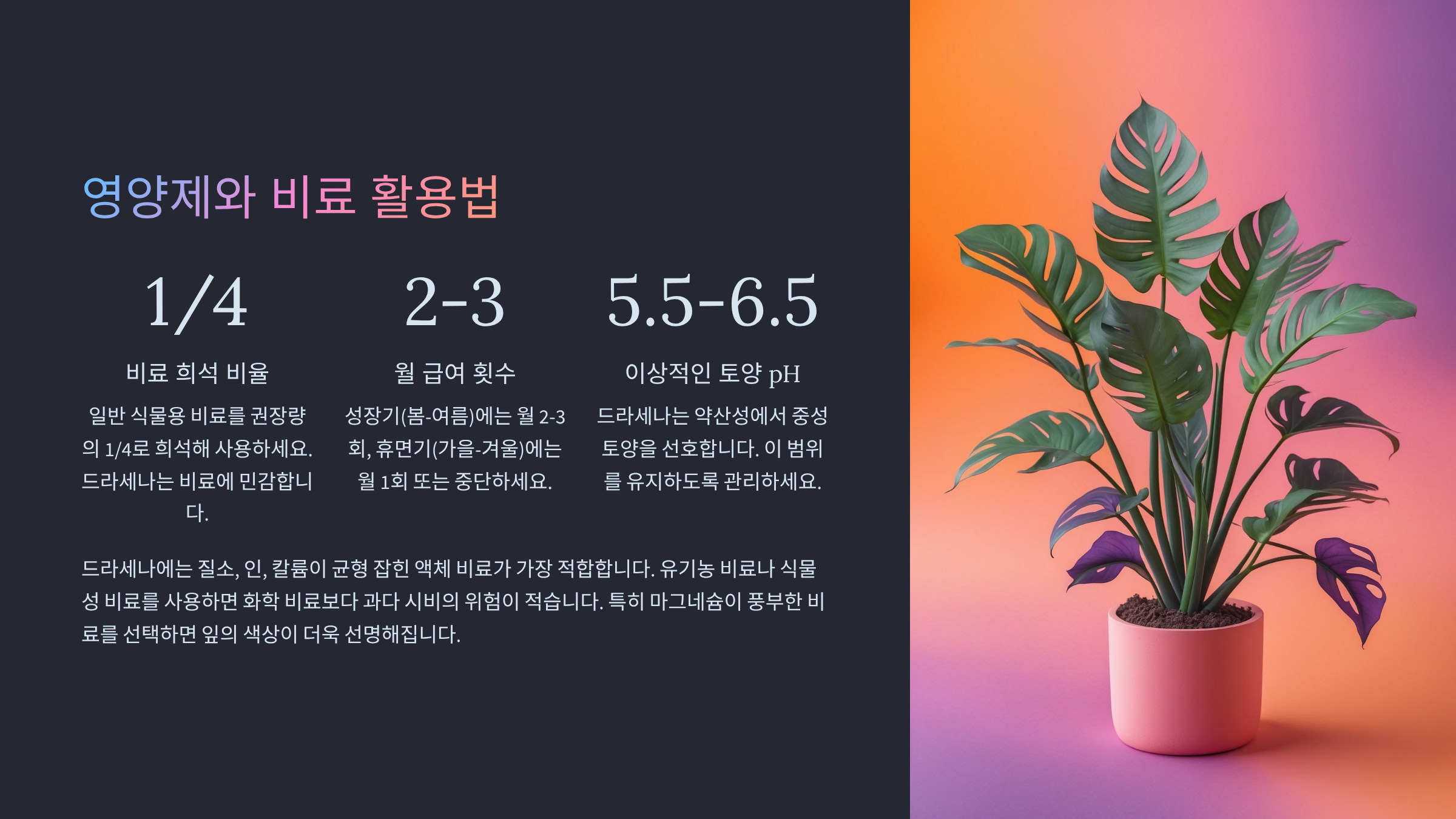 비료는 봄~여름에는 4주 간격으로 완효성 비료를 소량 사용하는 것도 좋지만, 가을 이후엔 사용을 멈추는 게 좋아요. 비료는 너무 많이 주면 오히려 뿌리를 상하게 하고, 염류가 축적되어 흙이 딱딱해지기도 해요. 드라세나는 욕심부리면 오히려 탈나요.