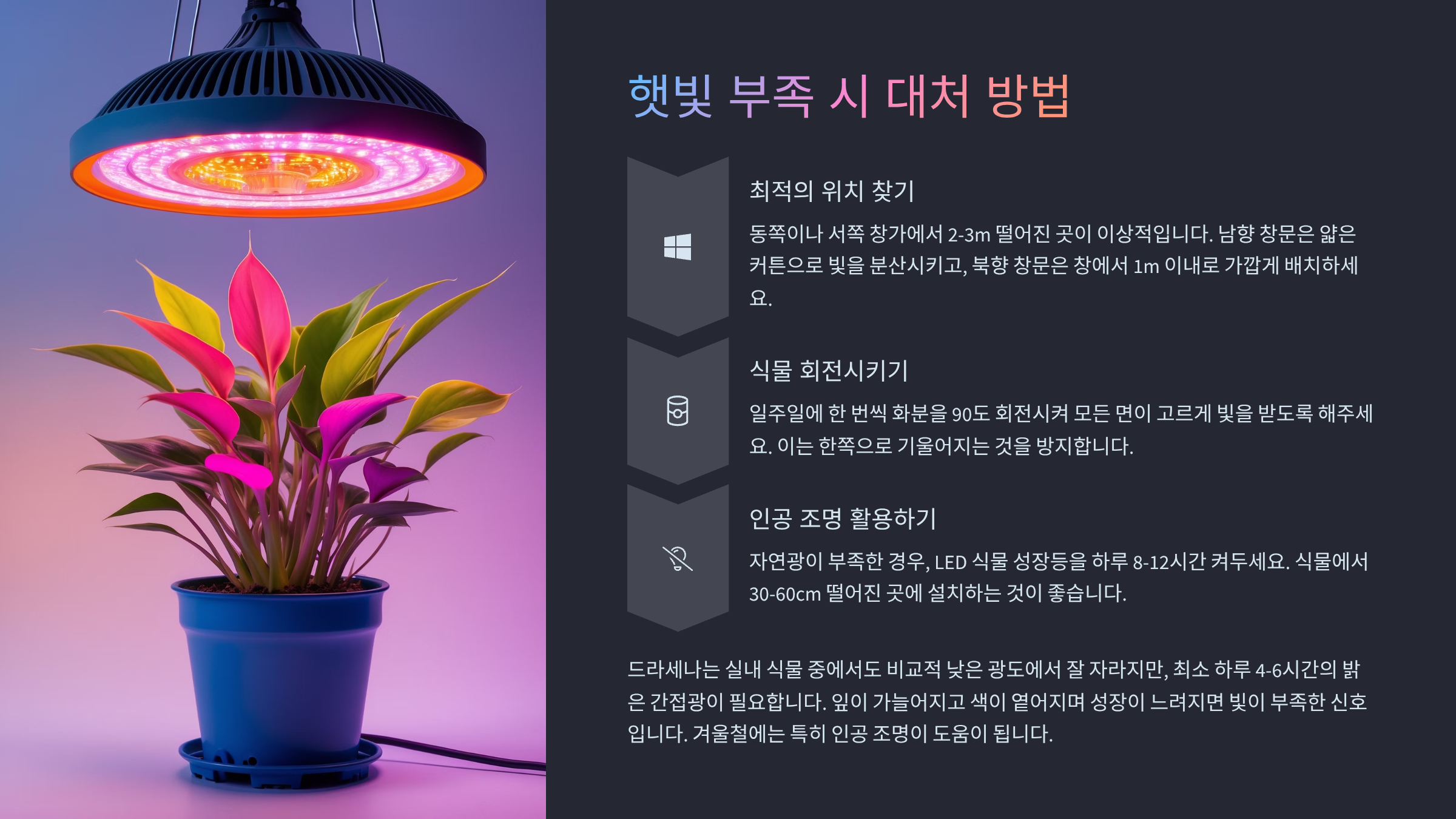LED 조명은 ‘주광색(6,500K)’이 드라세나에게 가장 효과적이에요. 타이머를 설정해서 하루 6~8시간 정도 일정하게 빛을 제공하면 광합성 효율을 높일 수 있어요. 특히 베란다나 복도처럼 자연광이 아예 없는 곳에선 이 조명이 큰 역할을 해줘요 💡