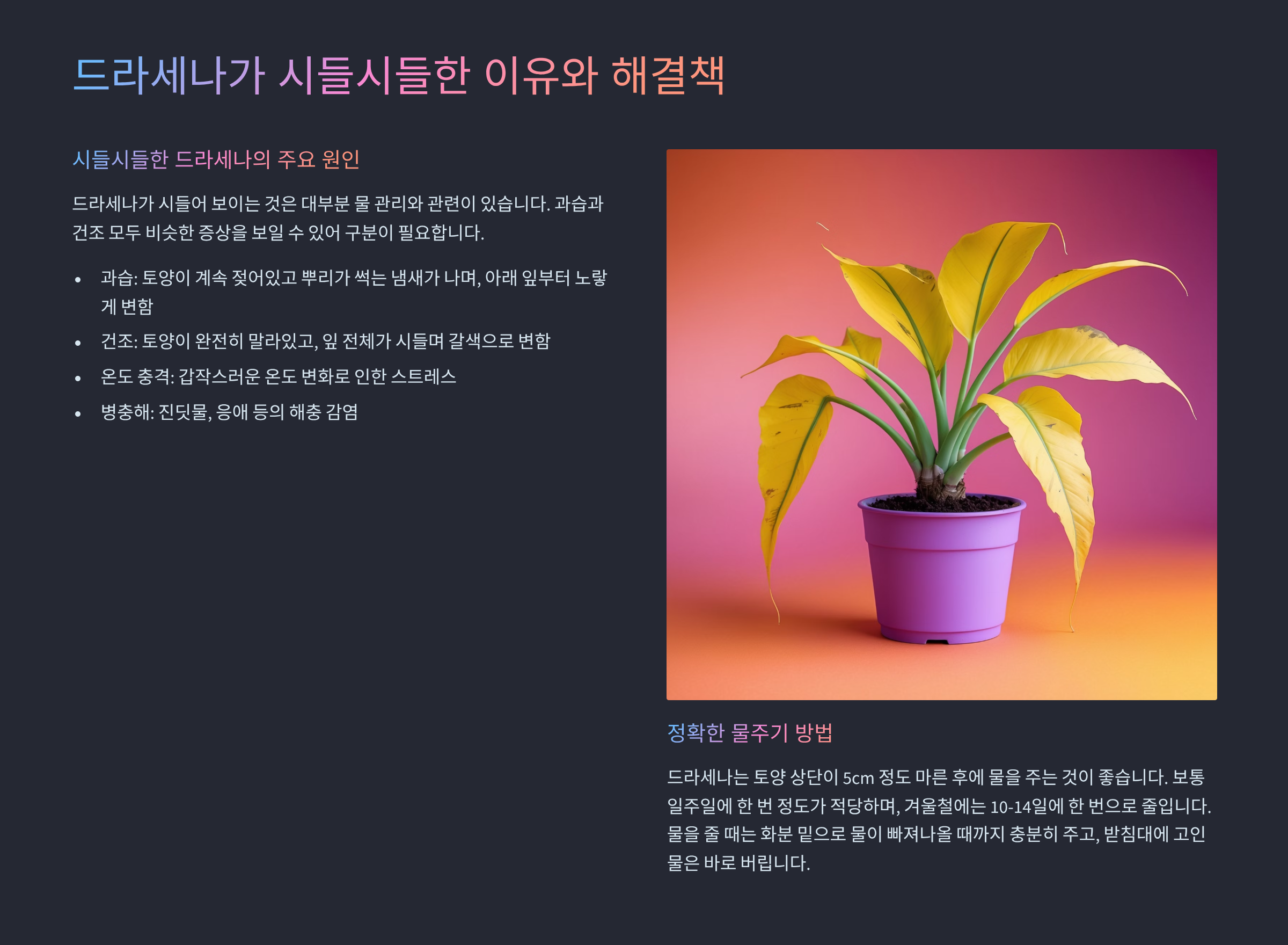 이 글은 드라세나 식물 관리에 대한 일반적인 정보를 제공하는 용도로 작성되었으며, 특정 상태나 병해충에 대한 전문적인 수의학적 진단이나 처방을 대체하지 않습니다. 식물 상태가 악화될 경우 전문가의 도움을 받는 것을 권장드려요 🌿