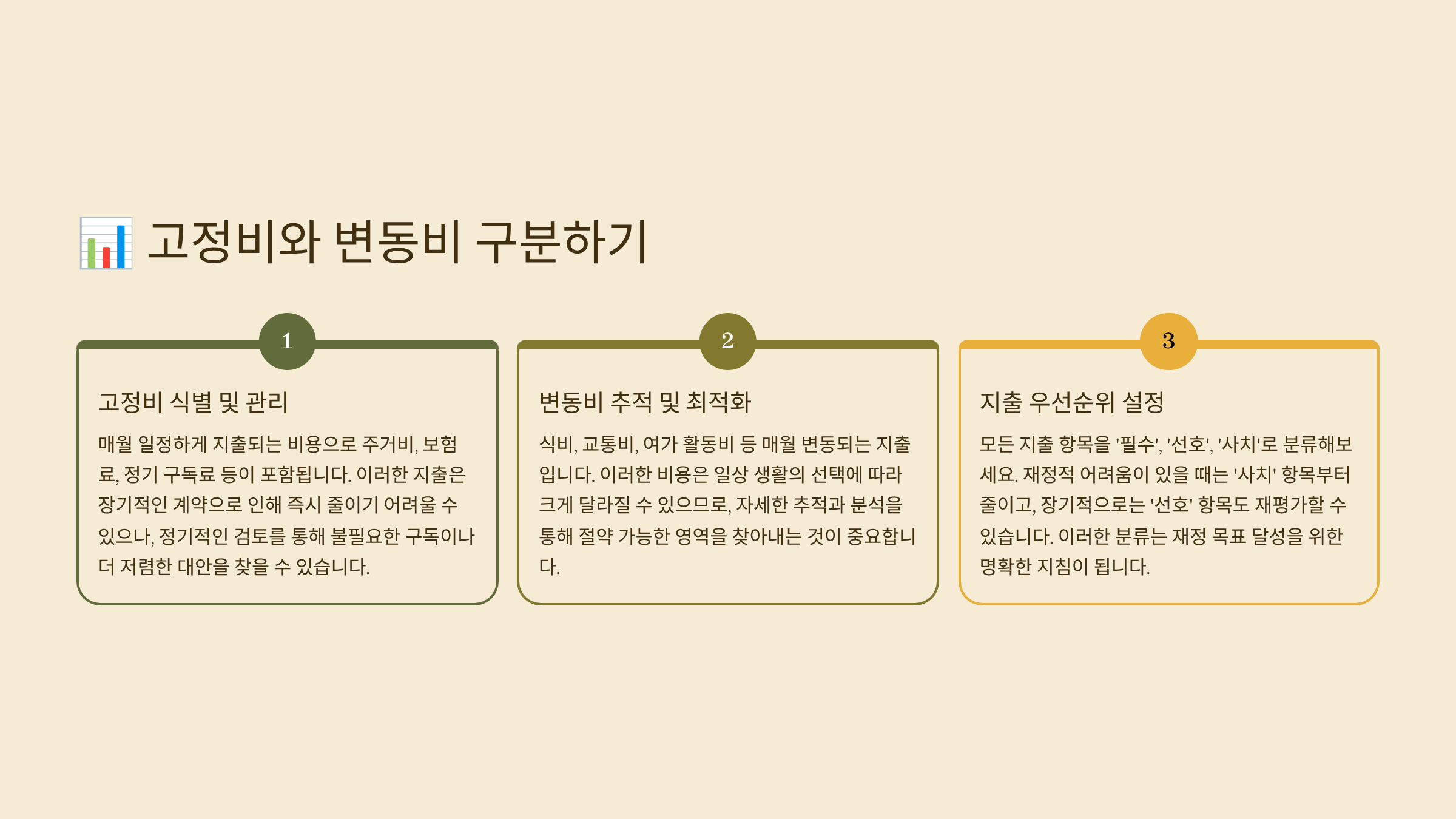 | 고정비 | 주거비, 대출, 통신비 | 장기적 재조정 |