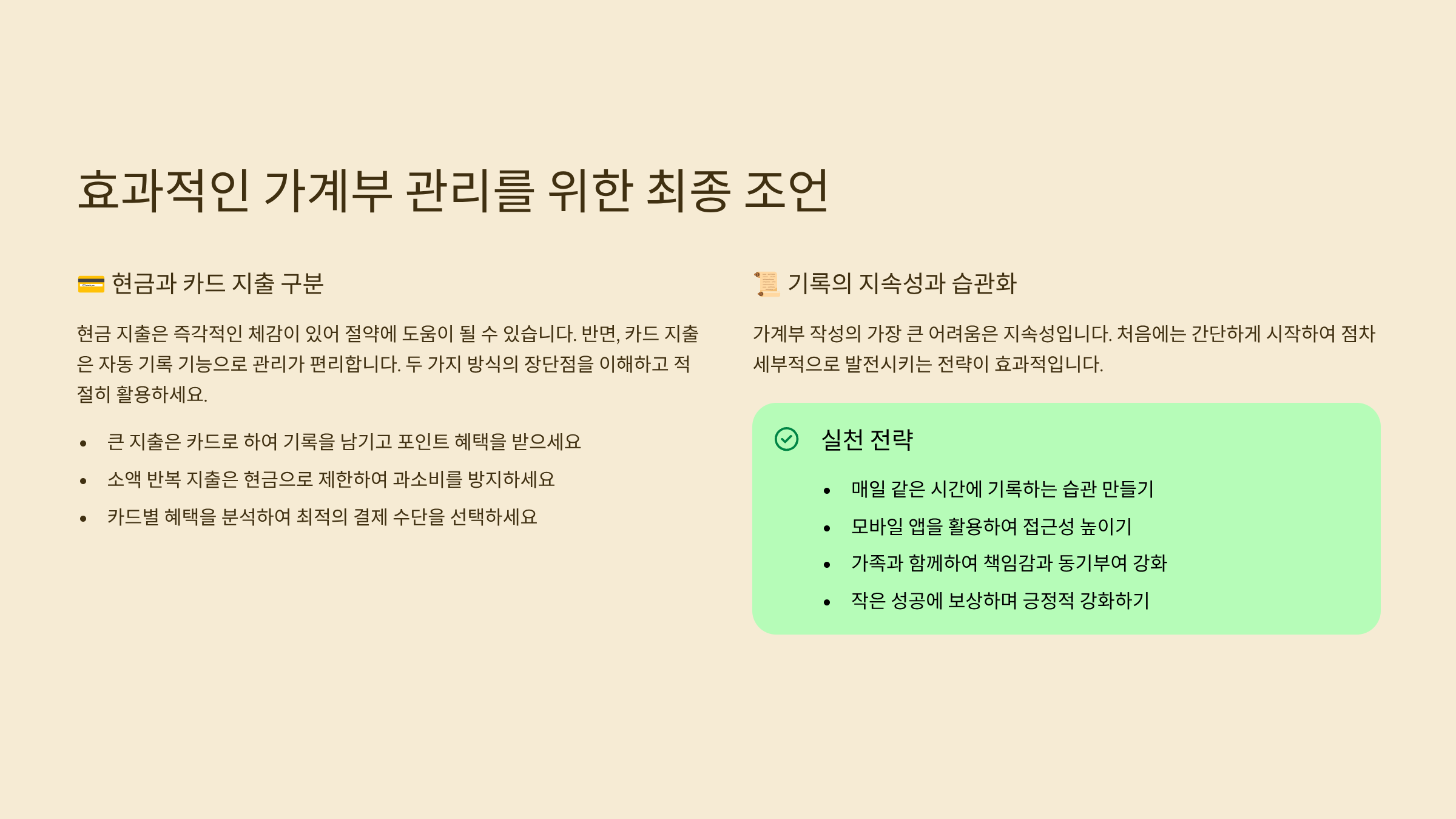 실패 없는 가계부 작성은 '기록의 지속성 + 분석의 습관화'예요. 이 두 가지가 결합되면 돈이 모이는 구조가 자연스럽게 만들어져요.