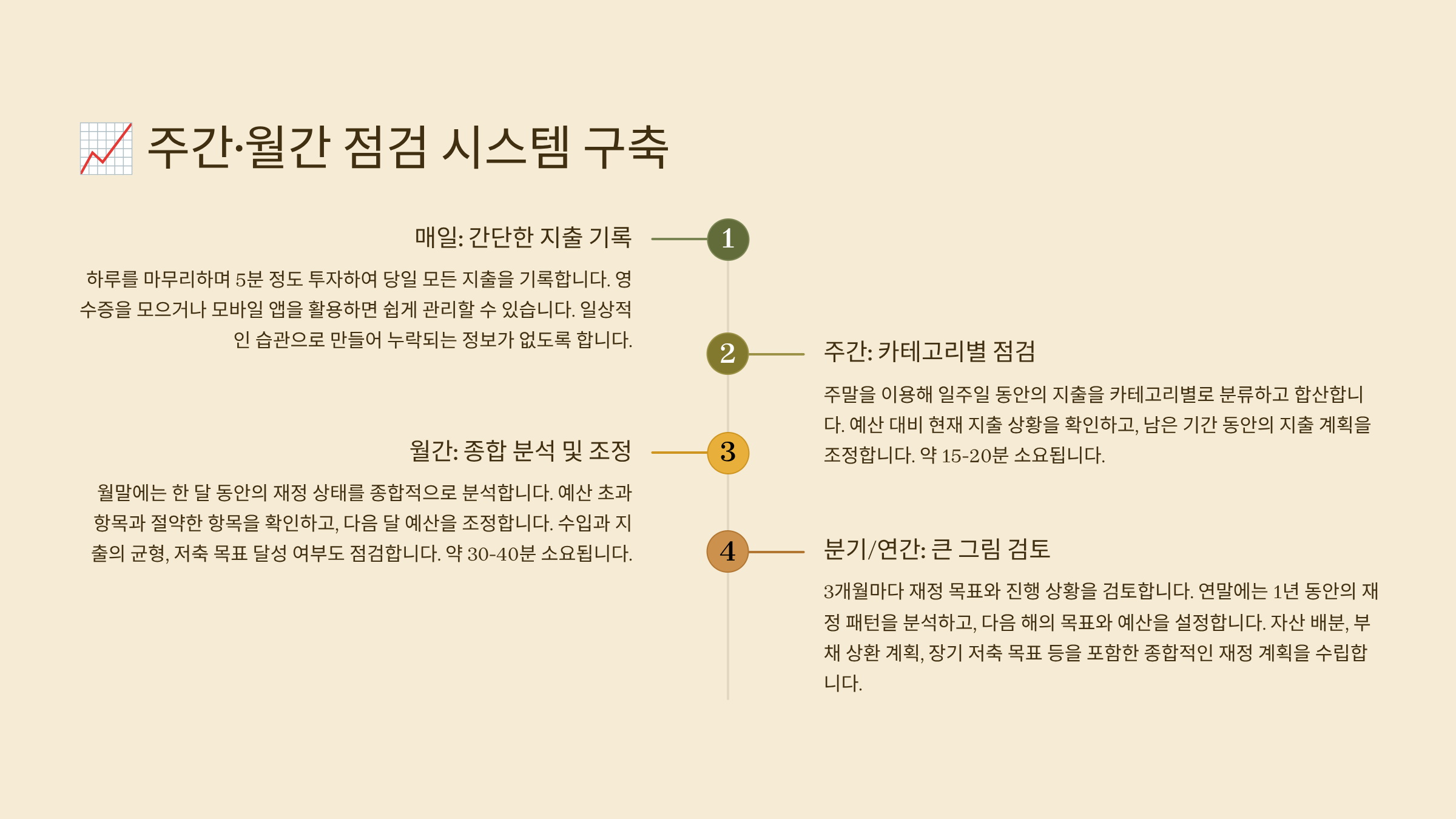 | 주간 점검 | 매주 일요일 | 소비 패턴, 불필요 지출 |