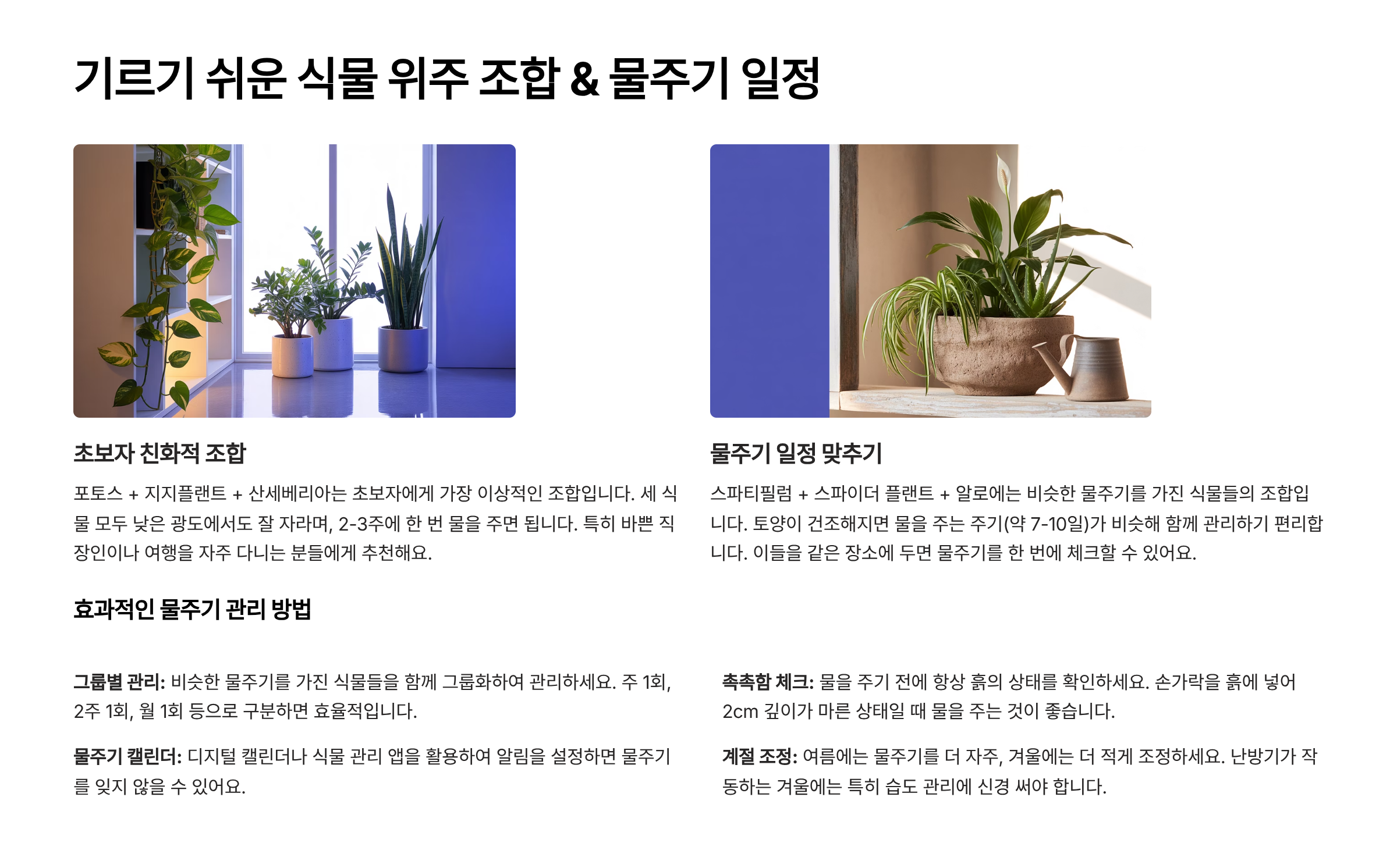 | 조합 식물 | 추천 물주기 주기 | 주의사항 |