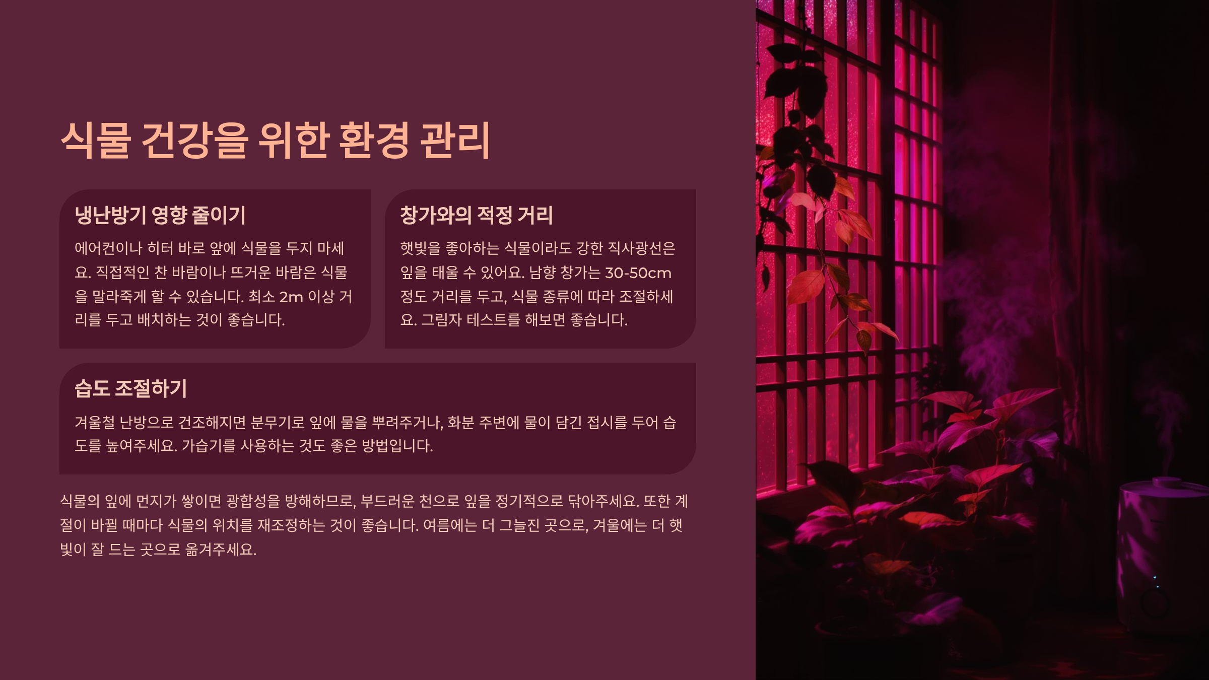 겨울철 난방도 조심해야 해요. 온풍기나 바닥 난방은 뿌리나 수분 증발을 지나치게 빠르게 만들어서 생장을 방해할 수 있거든요. 가습기와 병행해서 쓰면 습도 유지에도 도움이 되고 잎 끝이 마르는 현상을 막을 수 있어요.