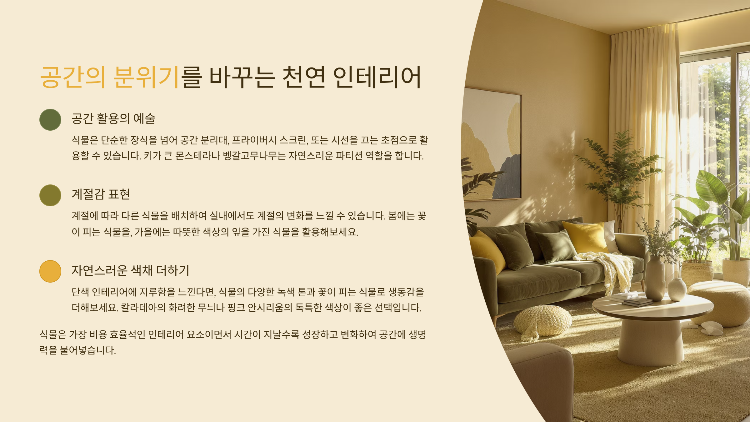 리빙룸, 카페, 갤러리, 리조트 인테리어에 자주 활용되는 이유도 바로 이런 점이에요. 화분 하나만으로도 공간 전체에 천연의 온기를 불어넣는 효과가 있다는 것, 생각보다 많은 디자이너들이 주목하고 있어요 🎨