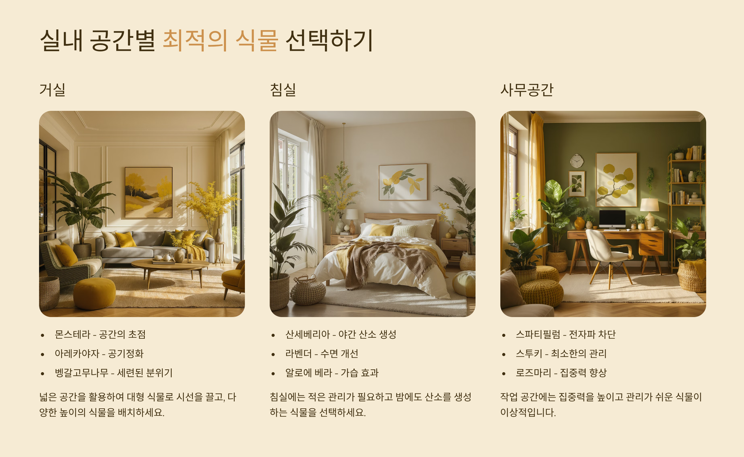 | 거실 | 중형~대형 | 포인트 식물, 공간 분위기 주도 |