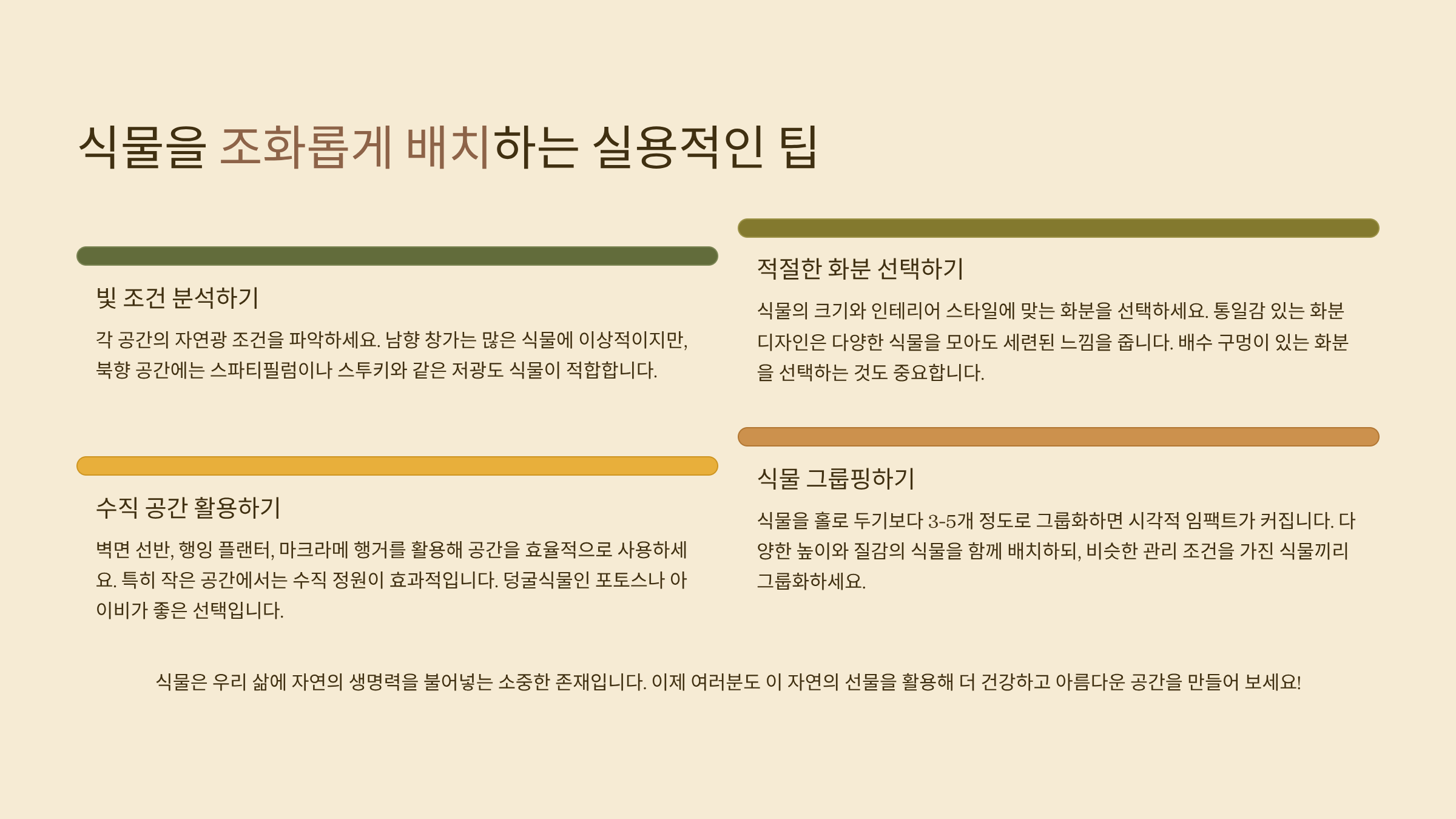 | 서재/공부방 | 책상 옆 또는 뒤쪽 | 집중력 향상, 편안한 시선 분산 |