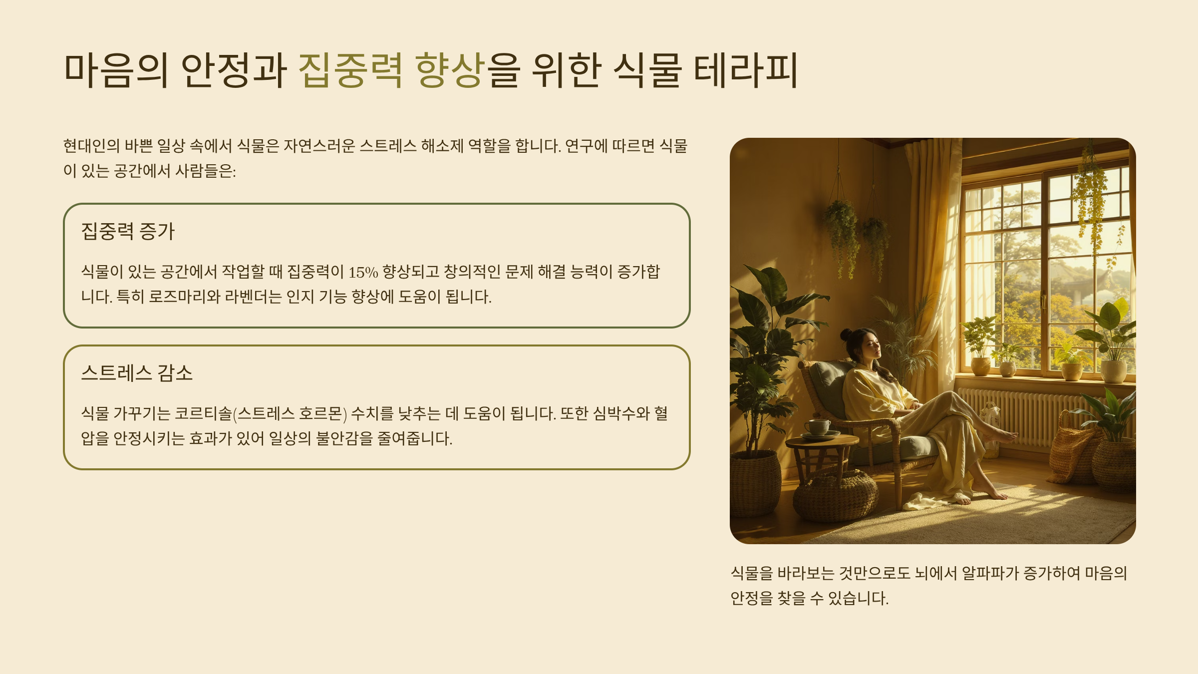 벤자민 고무나무는 단순히 공기를 정화하는 기능을 넘어서 우리의 뇌 활동과 집중력에도 좋은 영향을 준답니다. 식물이 있는 공간에서는 뇌의 피로도가 줄어들고 작업 효율이 눈에 띄게 올라간다는 연구 결과가 있어요.