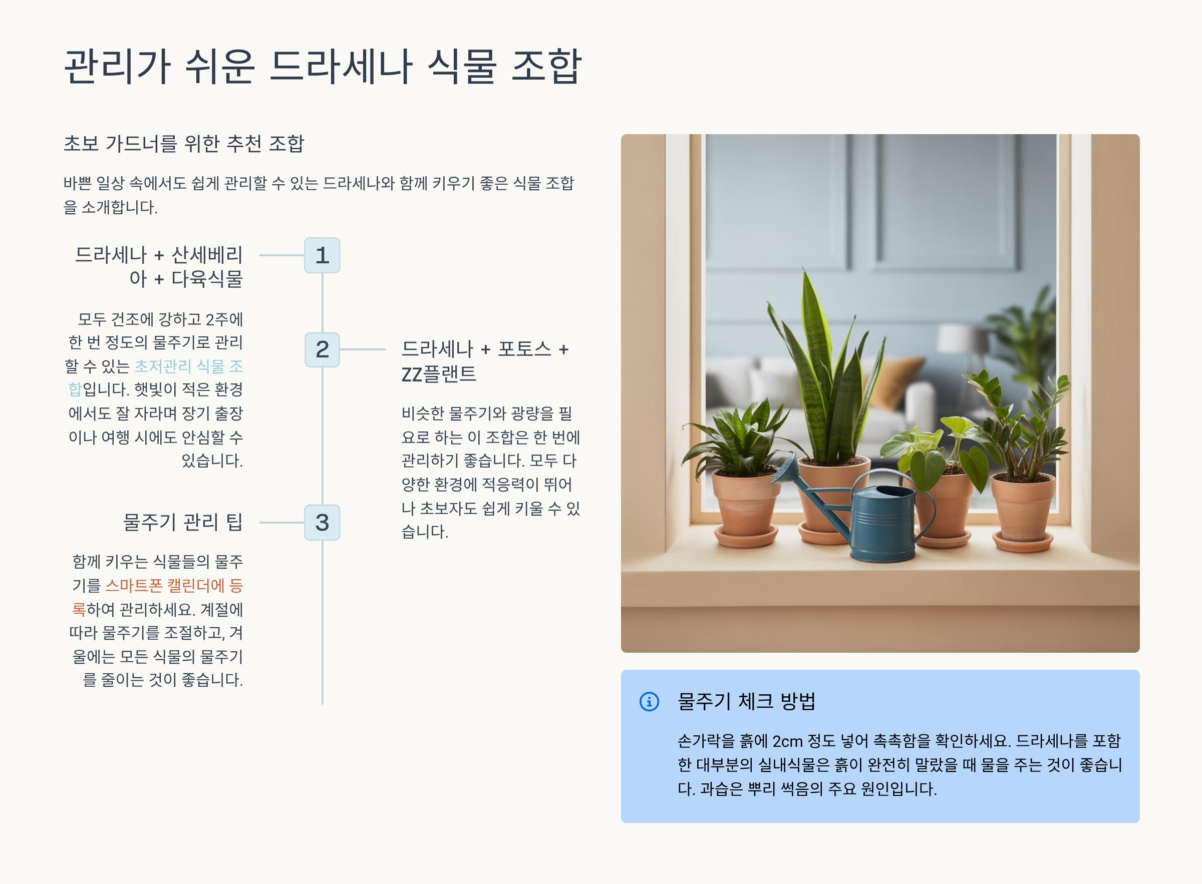 식물 키우기가 처음이거나 바쁜 라이프스타일을 가진 분들은 관리가 간편한 식물 조합이 필요해요. 드라세나는 이미 관리가 쉬운 편이지만, 함께 키울 식물도 마찬가지로 키우기 쉬운 걸로 선택하면 부담이 훨씬 줄어요. 추천하는 식물은 아이비, 펄제이드, 호야예요.
