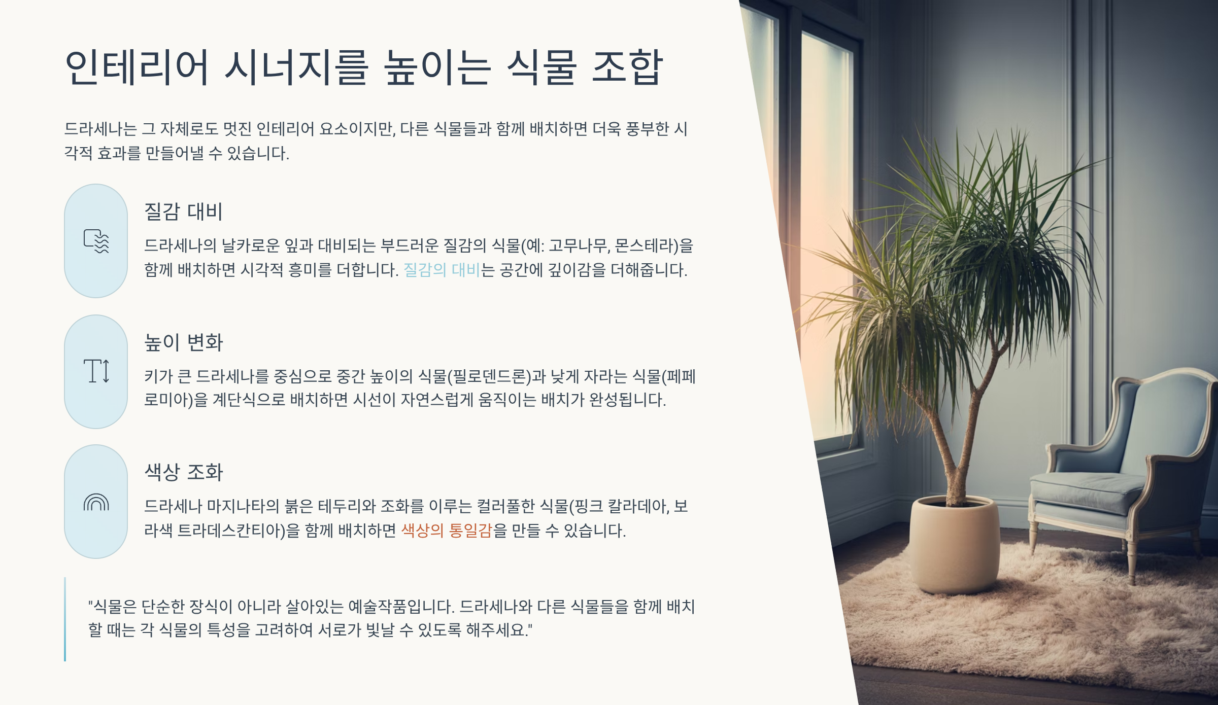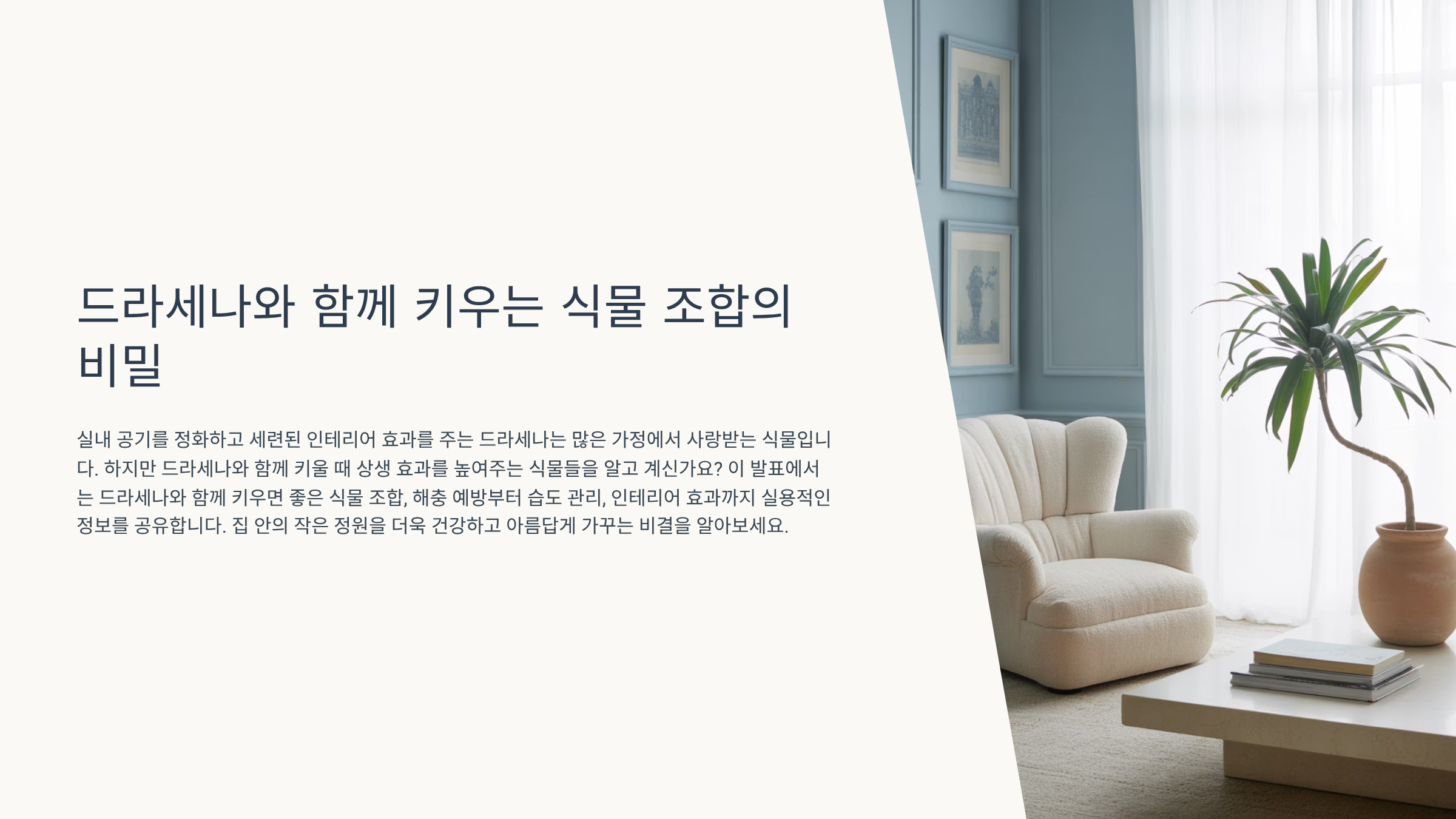 드라세나는 독특한 줄기와 매력적인 잎 모양으로 많은 사람들에게 사랑받는 반려식물이에요. 생명력이 강하고 적응력이 좋아 초보자들도 쉽게 키울 수 있는 식물 중 하나죠. 하지만 드라세나 하나만으로는 공간에 부족함을 느낄 수도 있어요. 이럴 때 다른 식물과 함께 키우면 분위기도 풍성해지고 식물 건강에도 긍정적인 영향을 줄 수 있어요.