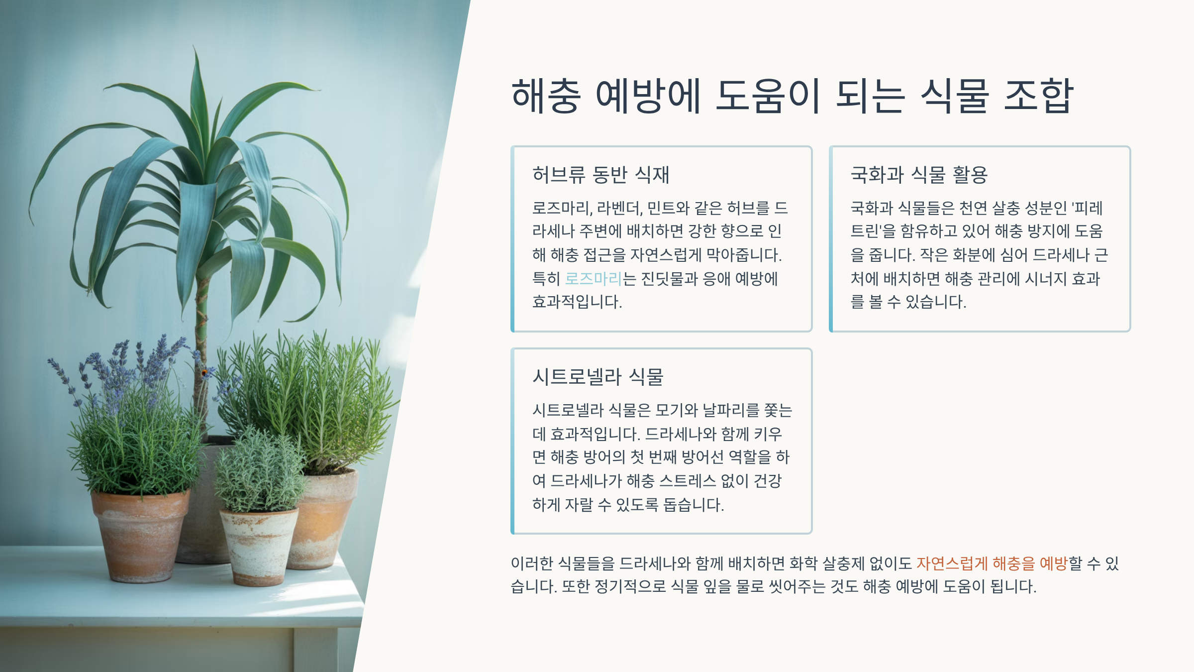 드라세나는 일반적으로 병충해에 강한 식물이지만, 실내 환경에 따라 응애, 깍지벌레 등이 생길 수 있어요. 이럴 때 천연 방충 효과를 가진 식물을 함께 키우면 도움이 되는데요, 대표적으로 로즈마리, 라벤더, 페퍼민트 같은 허브 종류가 좋아요. 이 식물들은 해충을 멀리하게 만드는 향을 가지고 있어 실내에서 키우면 자연스럽게 방제 효과를 볼 수 있어요.