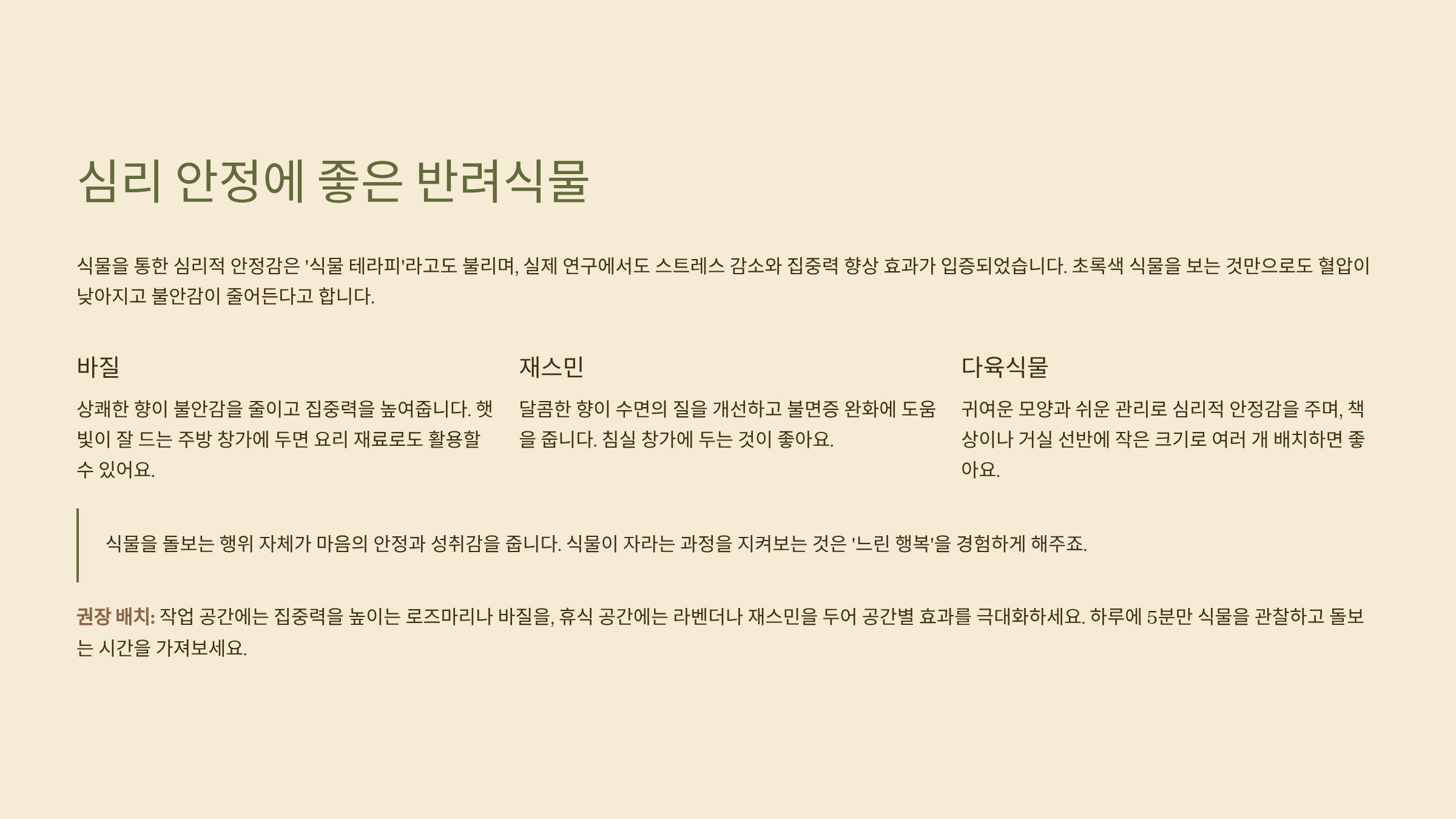 | 식물 | 심리 효과 | 추천 장소 |