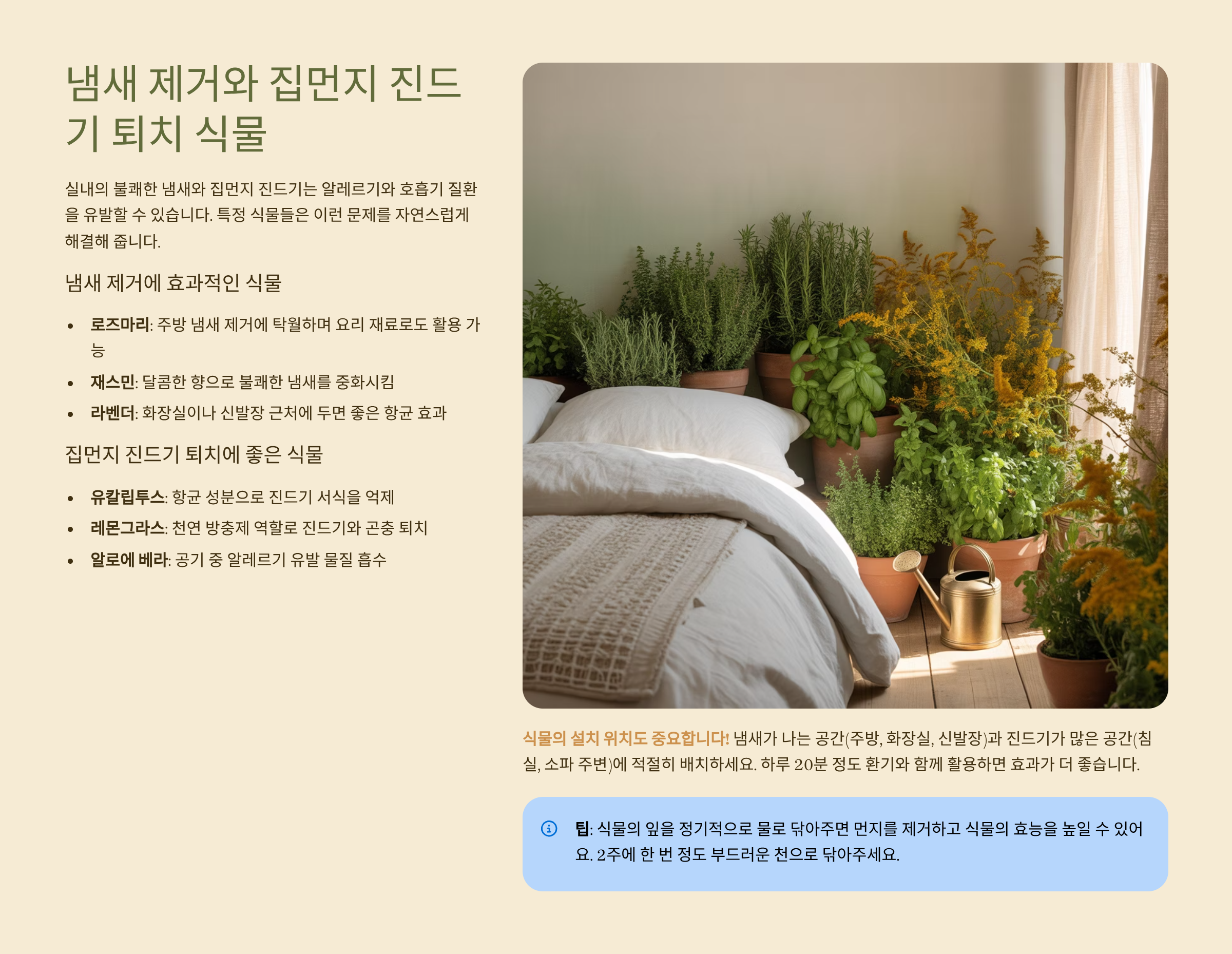 이런 식물들과 함께 제습기나 수분받침을 조합하면 집 안 전체의 쾌적함이 훨씬 좋아져요. 특히 침실, 아이 방, 옷방처럼 진드기에 민감한 공간에 추천해요🛏