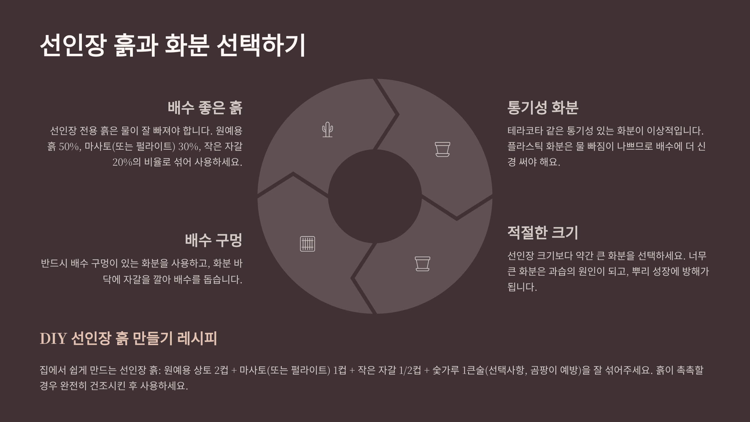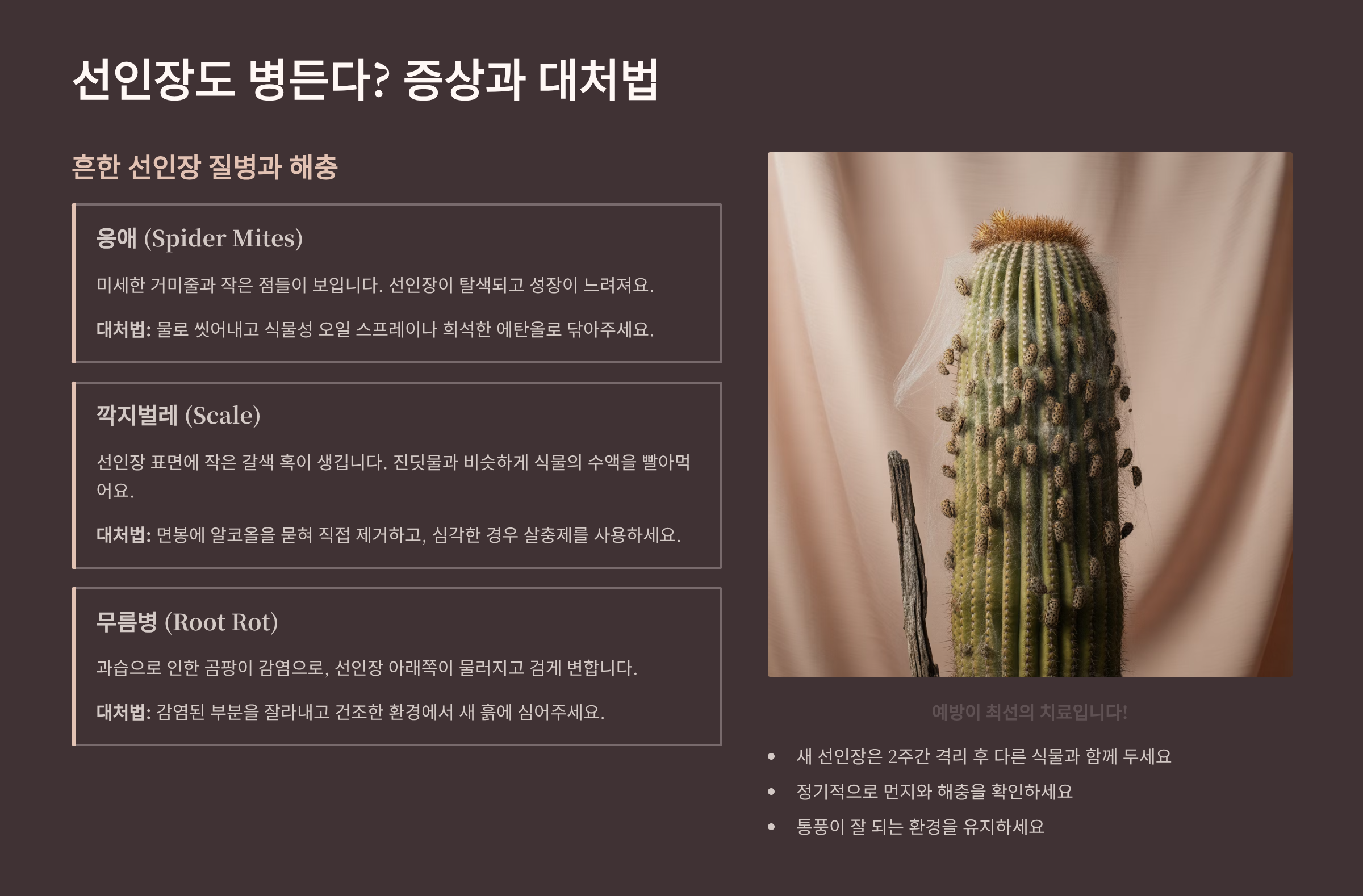 📌 본 콘텐츠는 일반적인 선인장 관리 정보를 제공하기 위한 것이며, 식물의 종류, 실내 환경, 계절에 따라 결과가 달라질 수 있어요. 식물 상태가 심각할 경우 전문가의 진단이 필요할 수 있습니다.