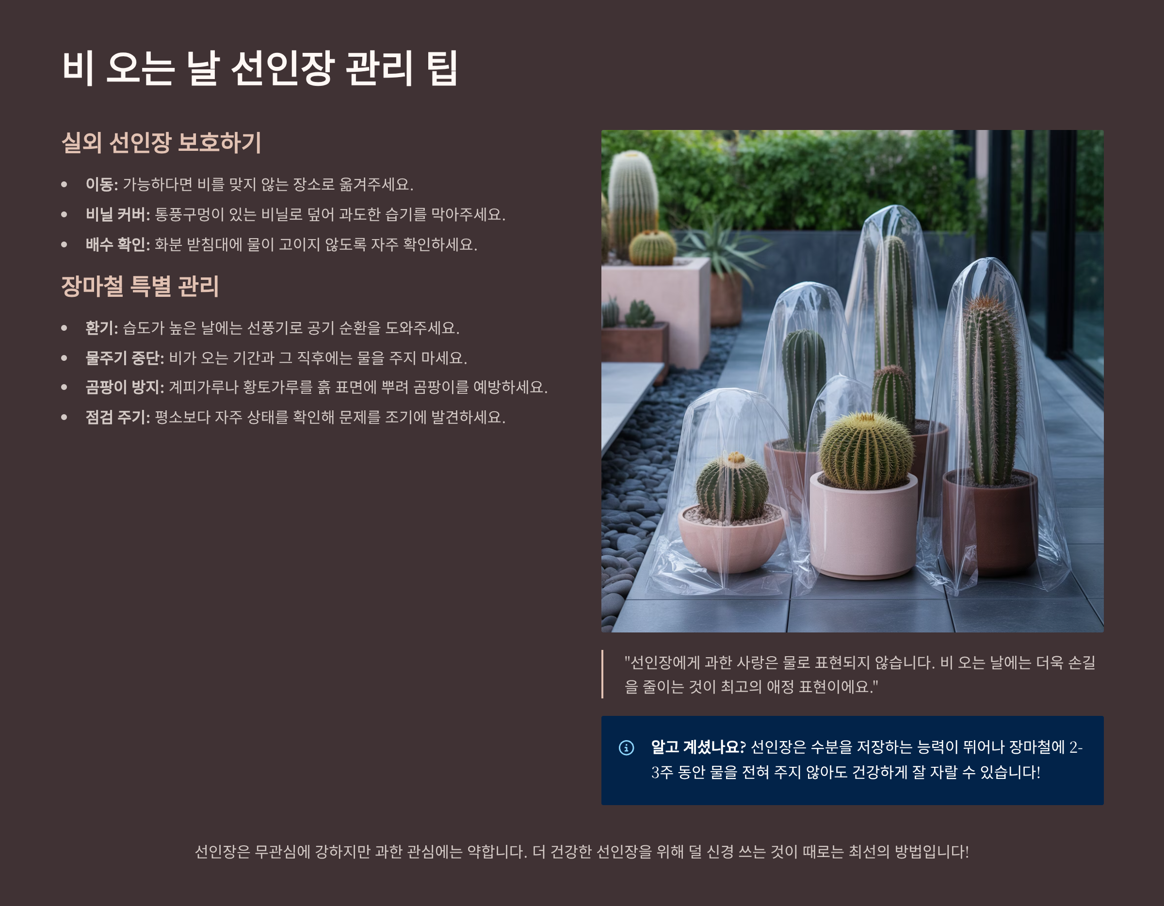 비 오는 날엔 선인장을 잠시 실내로 옮기거나, 환기가 잘 되는 공간으로 이동시켜주는 게 좋아요. 너무 젖은 상태가 오래가면 잎이나 몸통에 곰팡이균이 생길 수 있어요. 가능하면 팬을 틀거나 선풍기를 활용하는 것도 좋아요.