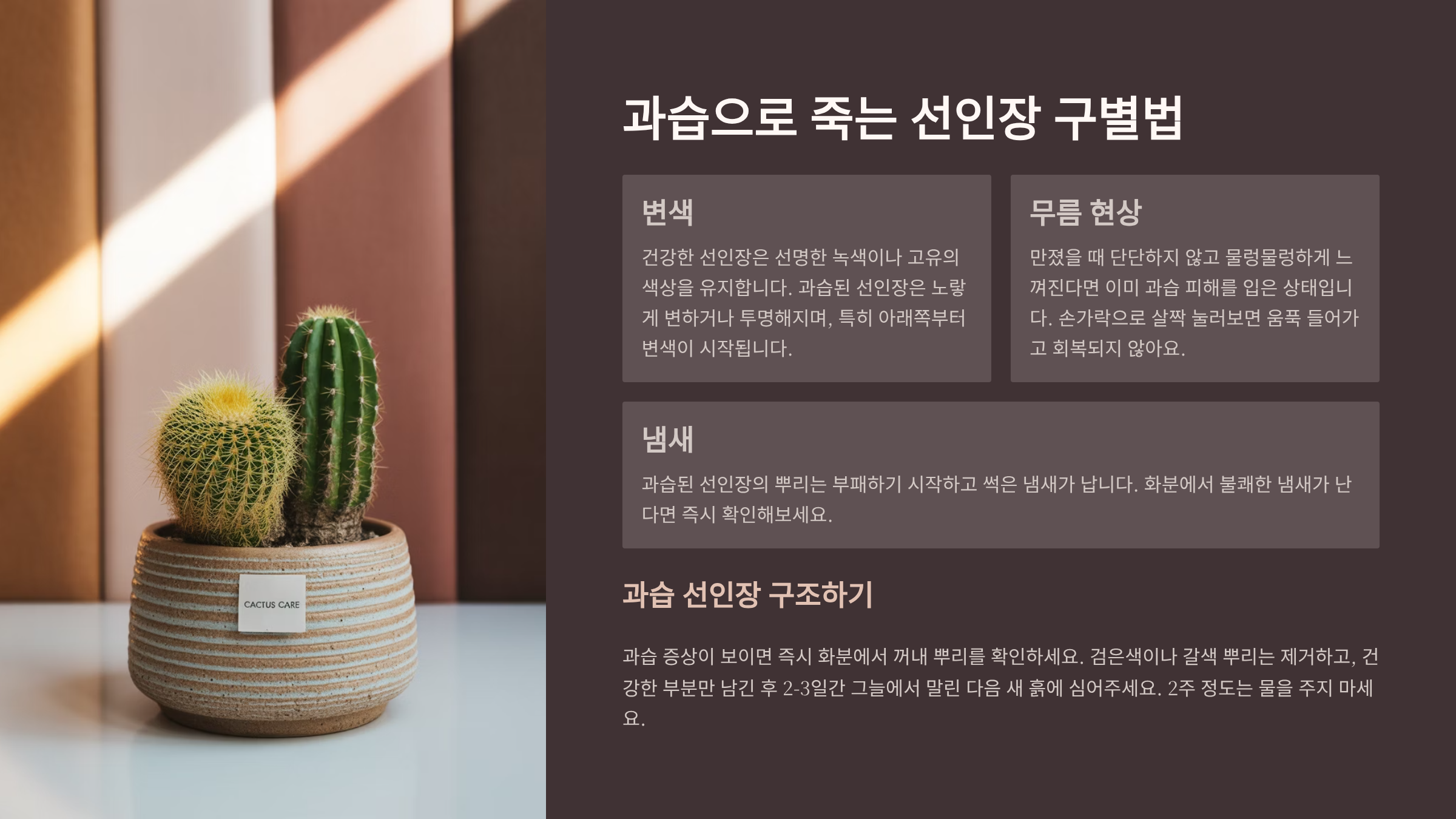 과습의 신호는 선인장이 말랑말랑해지거나 색이 누렇게 변하는 거예요. 특히 아랫부분부터 물렁해진다면 뿌리 쪽부터 썩어들어가고 있다는 증거예요. 화분을 기울였을 때 물이 쏟아질 정도라면 이미 위험한 상태예요.